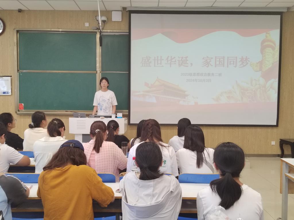 为在班级内厚植爱国情怀,培育民族自豪感,10月3日上午,永利集团官网2023级思想政治教育二班在社科楼515教室召开“盛世华诞,家国同梦”主题班会。本次班会由班长王慜初主持,全体二班同学参加。