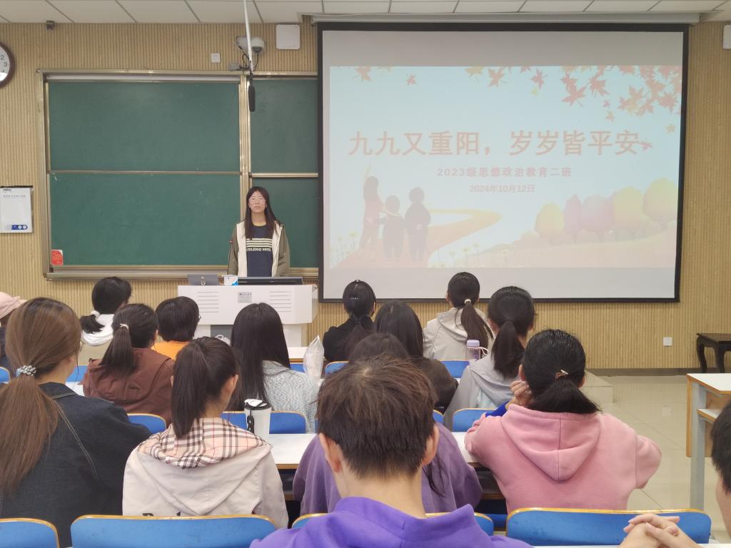 为在班级内弘扬中华优秀传统文化,发扬中华民族传统美德,10月12日下午,永利集团官网2023级思想政治教育二班在社科楼515教室召开“九九又重阳,岁岁皆平安”主题班会。本次班会由班长王慜初主持,全体二班同学参加。