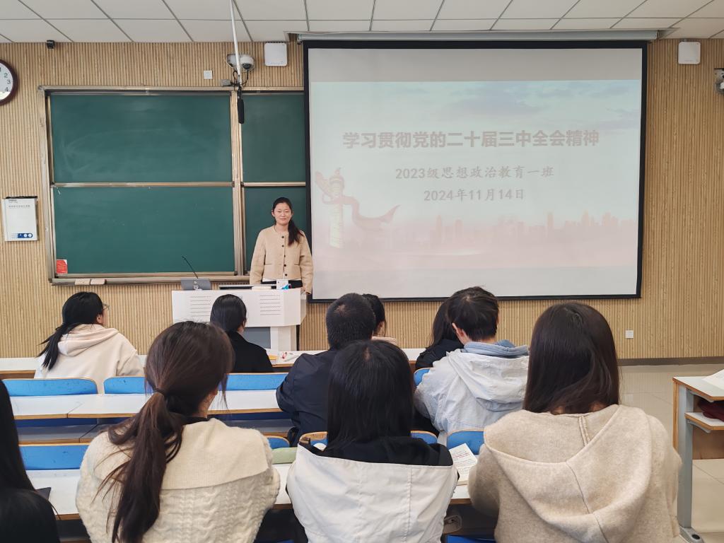 为了深入学习贯彻党的二十届三中全会精神,11月14日上午,永利集团官网2023级思想政治教育一班在社科楼515教室召开“学习贯彻党的二十届三中全会精神”主题团课。2023级思想政治教育一班全体同学参与本次团课,团课由团支书张卓主持。