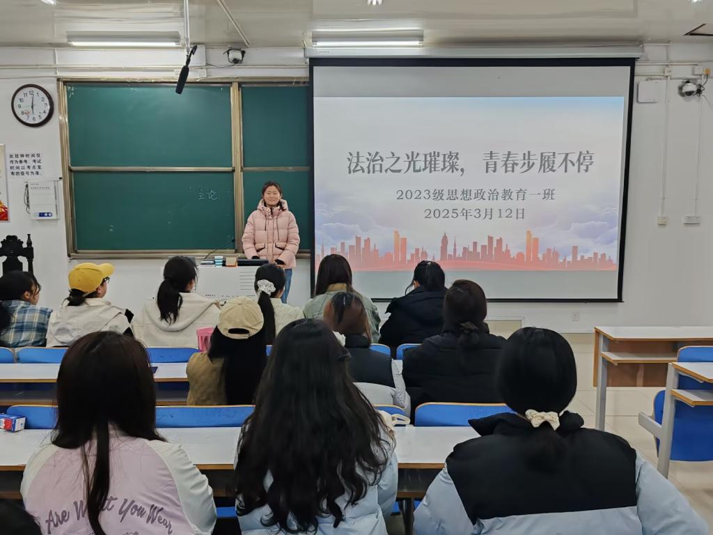 为提升同学们的法治素养,增强遵法守法意识,3月12日下午,永利集团官网2023级思想政治教育一班在社科楼515教室召开“法治之光璀璨,青春步履不停”主题班会。2023级思想政治教育一班全体同学参与本次班会,班会由班长张卓主持。