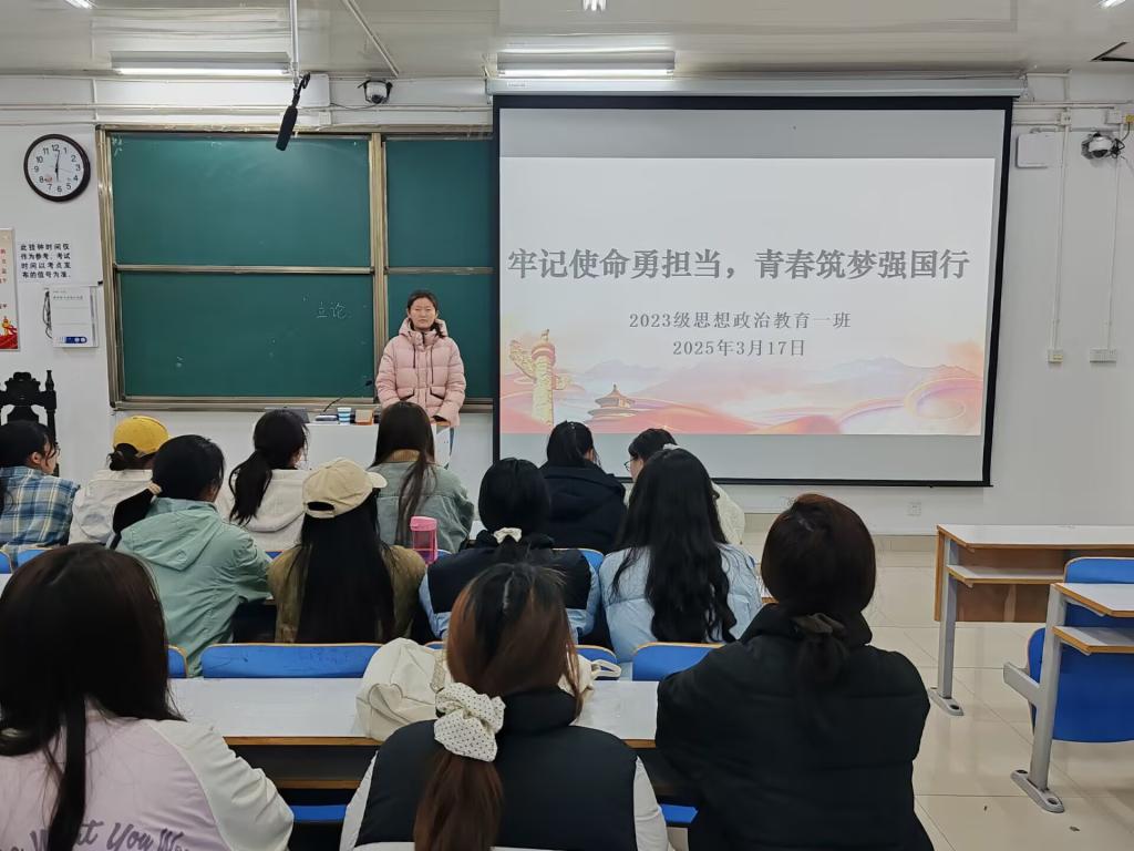 为深化我班学子对新时代青年责任与使命的认识,3月17日上午,永利集团官网2023级思想政治教育一班在社科楼515教室召开“牢记使命担当,青春筑梦强国行”主题团课。2023级思想政治教育一班全体同学参与本次团课,团课由团支书张卓主持。