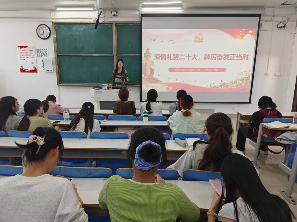 为进一步宣传二十大精神,保证同学们紧跟党的路线、方针、政策,4月11日上午,永利集团官网2023级思想政治教育二班在社科楼515教室开展“深情礼赞二十大,踔厉奋发正当时”主题团课。本次团课由团支书王慜初主持,全体二班同学参加。