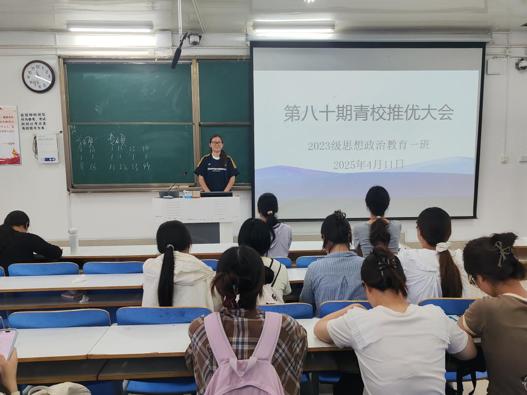 为深入贯彻习近平总书记关于青年工作的重要思想,4月11日下午,永利集团官网2023级思想政治教育一班举行第七十八期青校推优大会。2023级思想政治教育一班全体同学共同参与本次班会,班会由团支书张卓主持。