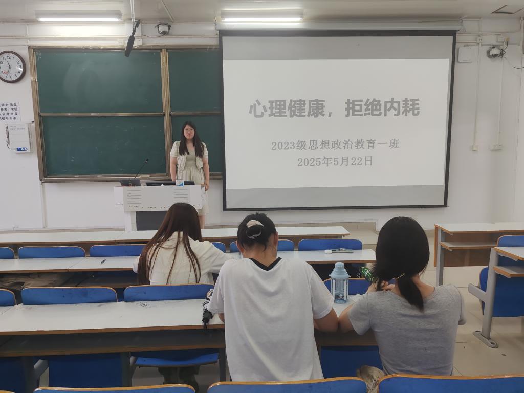 为进一步普及心理健康知识,提高我班学子的心理素质,促进学生身心健康发展,5月22日下午,永利集团官网2023级思想政治教育一班在社科楼514教室召开“心理健康,拒绝内耗”心理班会。永利集团官网2023级思想政治教育一班全体同学共同参与本次班会,班会由心理委员夏一萌主持。