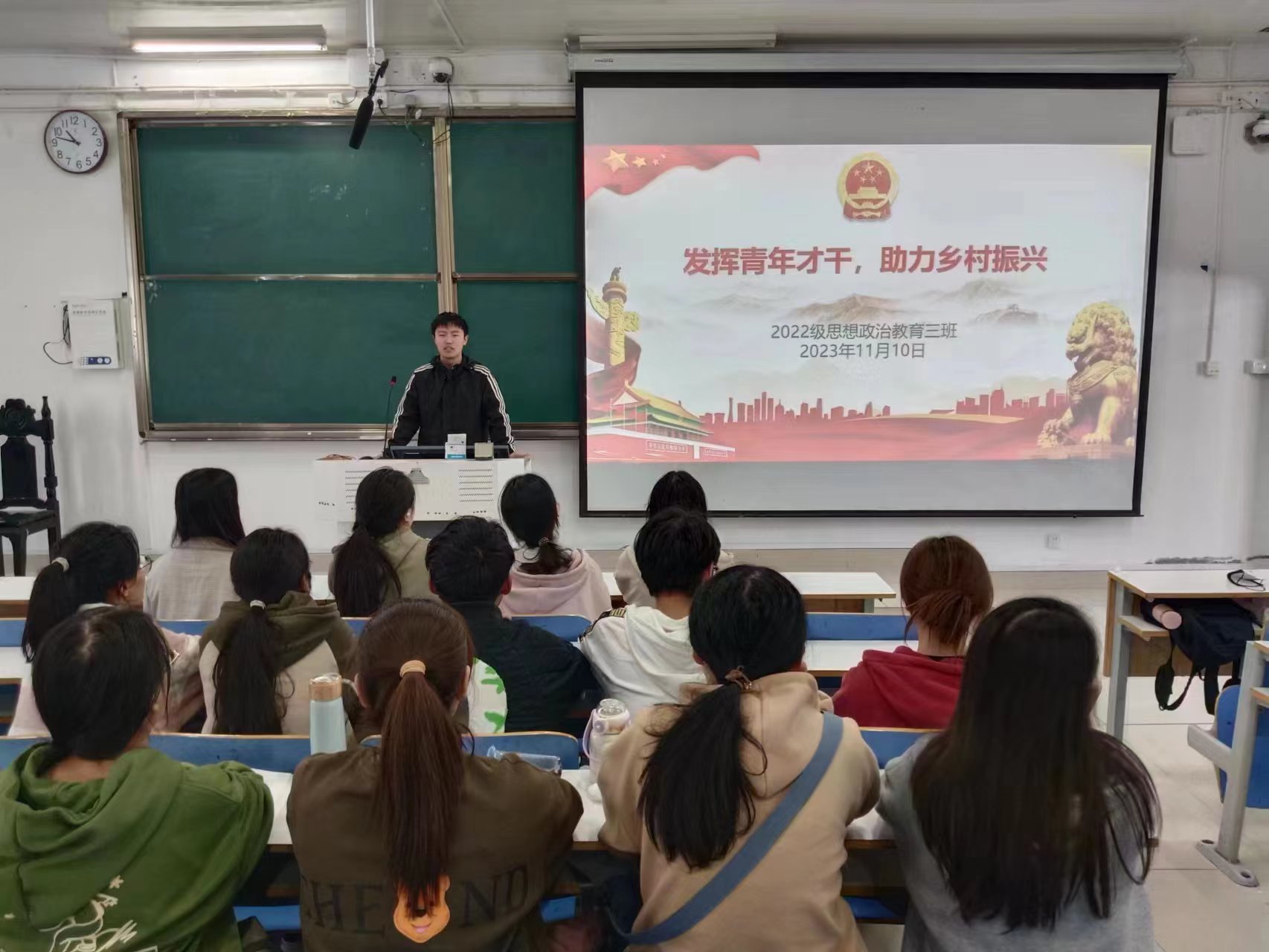 11月10日上午,永利集团官网2022级思想政治教育三班在社科楼514教室召开“发挥青年才干,助力乡村振兴”主题团课。永利集团官网2022级思想政治教育三班全体成员共同参与本次团课,团课由团支书余浩洋主持。