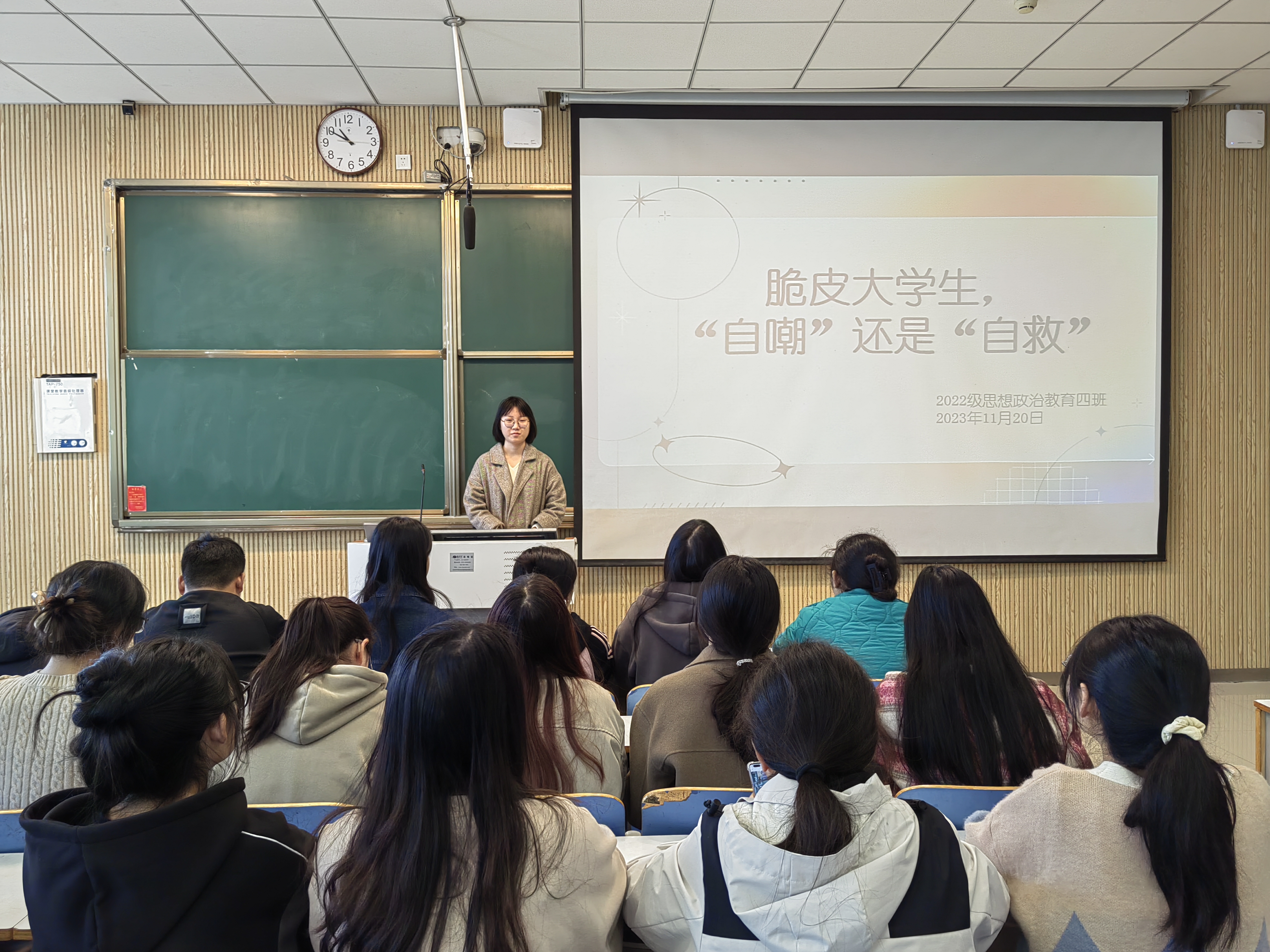 为了进一步提高本班同学的心理素质,深入开展心理健康教育,11月20日上午,永利集团官网2022级思想政治教育四班在社科楼515教室召开“脆皮大学生,‘自嘲’还是‘自救’”心理班会。永利集团官网2022级思想政治教育四班全体同学参与本次班会。本次班会由心理委员徐成若主持。