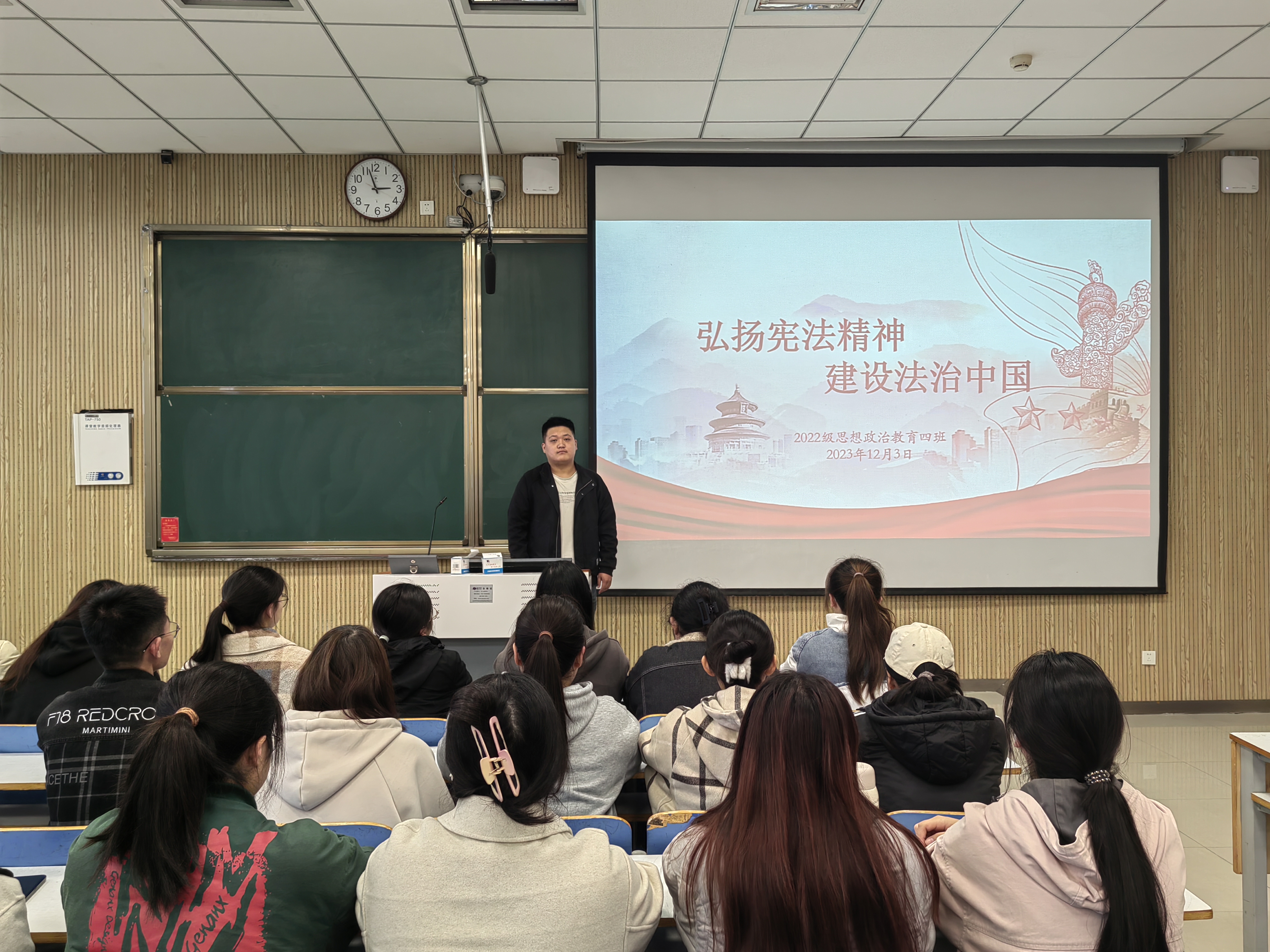 12月3日上午,永利集团官网2022级思想政治教育四班在社科楼515教室召开“弘扬宪法精神,建设法治中国”主题班会。永利集团官网2022级思想政治教育四班全体同学参与本次班会。本次团课由副班长宋奕铭主持。