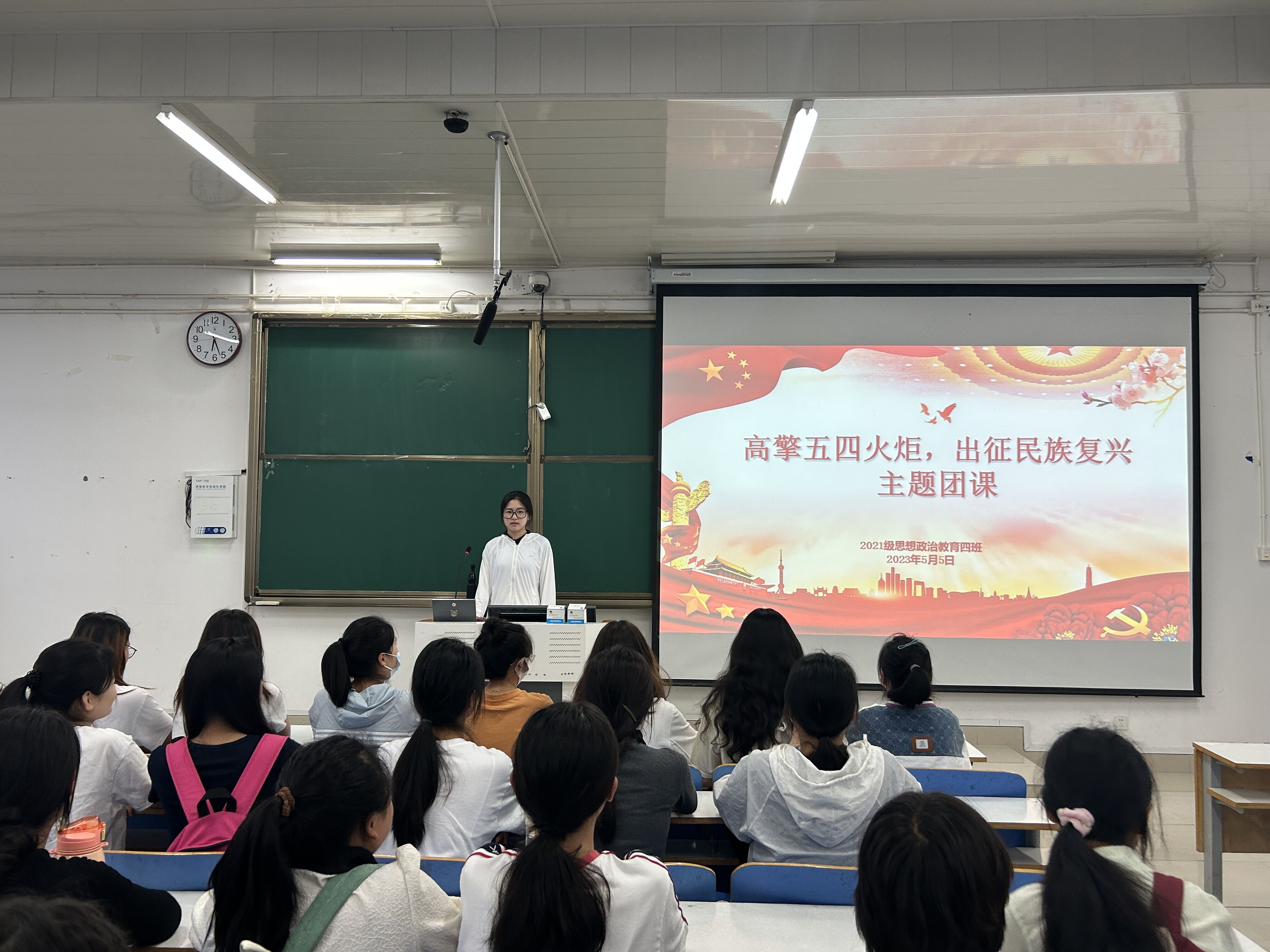 5月5日下午,永利集团官网2021级思想政治教育四班在社科楼514教室开展“高擎五四火炬,出征民族复兴”主题团课。2021级思想政治教育四班全体团员参加本次团课。团课由团支书刘珂含主持。
