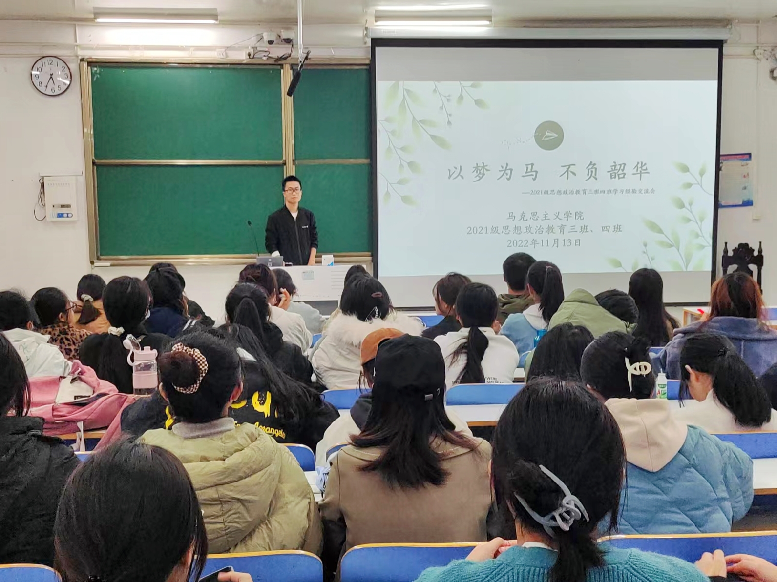 11月13日下午,永利集团官网2021级思想政治教育三班、四班在社科楼514召开“以梦为马,不负韶华”学习经验交流会。永利集团官网2021级思想政治教育三班全体成员以及2020级思想政治教育一班申畅畅、2020级思想政治教育二班岳子怡参与此次会议。会议由学习委员于坤鹏主持。