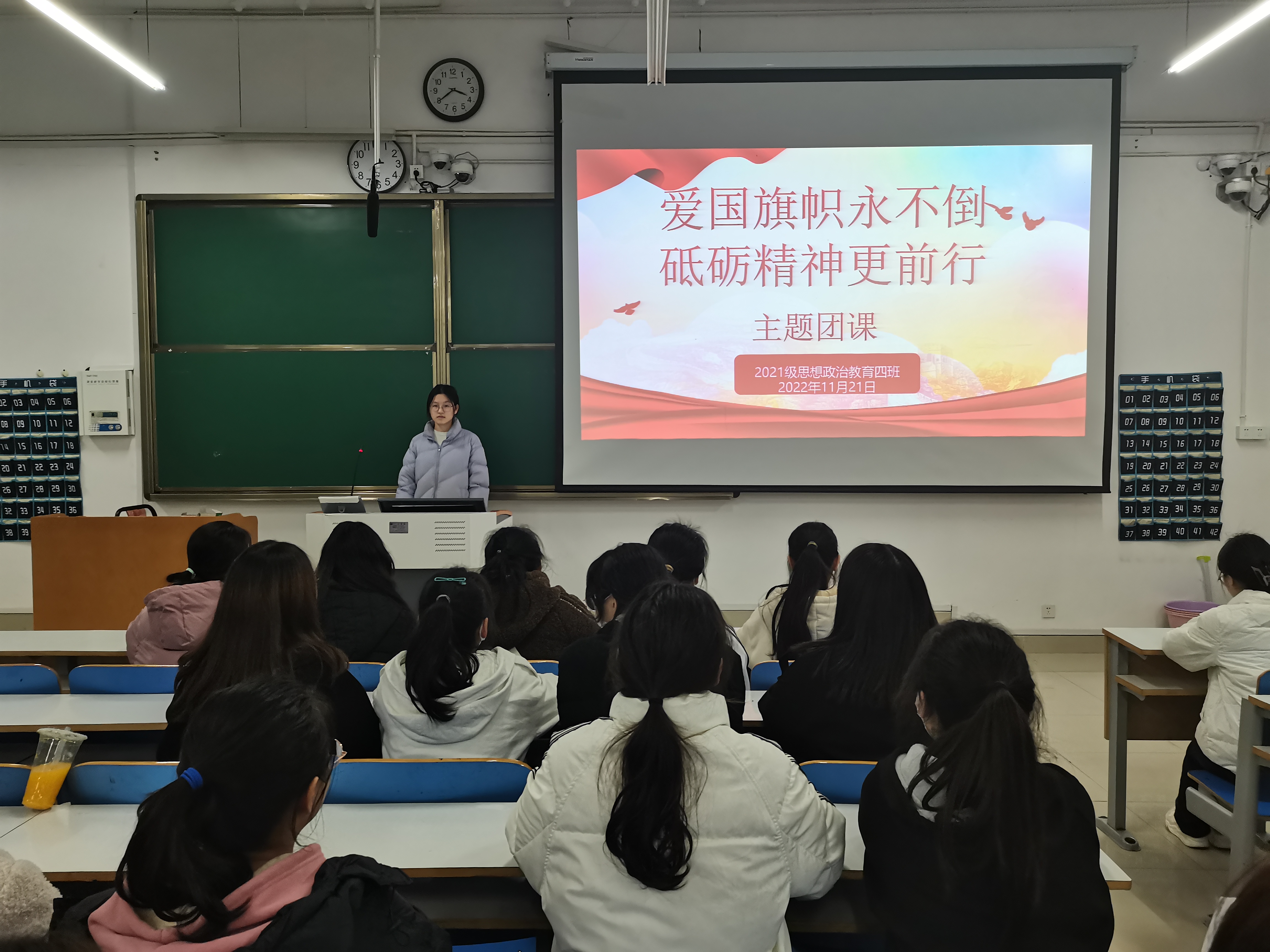 11月21日下午,永利集团官网2021级思想政治教育四班在社科楼514教室开展“爱国旗帜永不倒,砥砺精神更前行”主题团课。2021级思想政治教育四班全体学生共同参加本次团课。团课由团支书刘珂含主持。