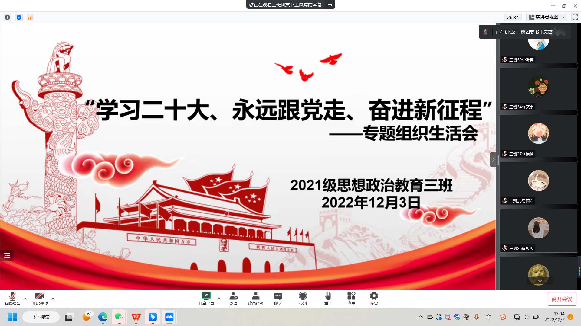 12月3日下午,永利集团官网2021级思想政治教育三班在线上召开“学习二十大、永远跟党走、奋进新征程”组织生活会。永利集团官网2021级思想政治教育三班全体成员参与此次会议。会议由团支书王岚霄主持。