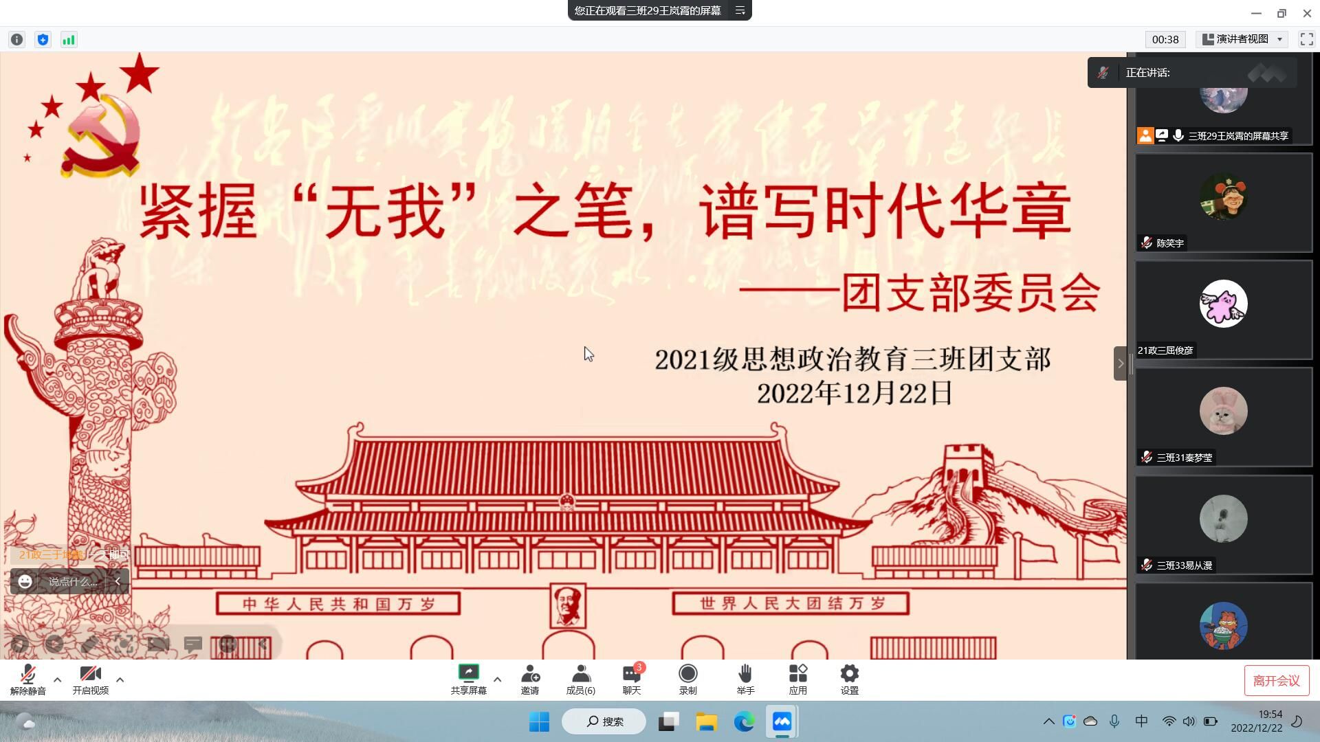 12月22日下午,永利集团官网2021级思想政治教育三班在线上召开“紧握‘无我’之笔,谱写时代华章”团支部委员会。永利集团官网2021级思想政治教育三班团支部委员会全体成员参与此次会议。会议由团支书王岚霄主持。