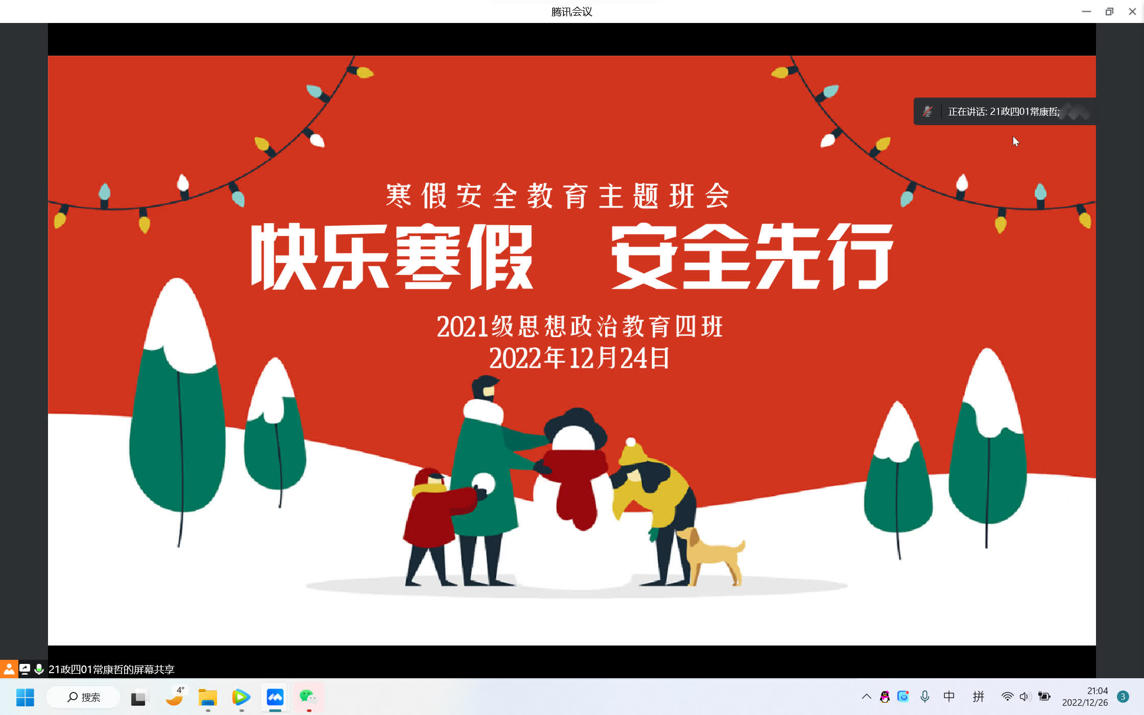 12月24日下午,永利集团官网2021级思想政治教育四班线上开展“快乐寒假,安全先行”安全教育主题班会。永利集团官网2021级思想政治教育四班全体同学参加本次会议。会议由副班长常康哲主持。