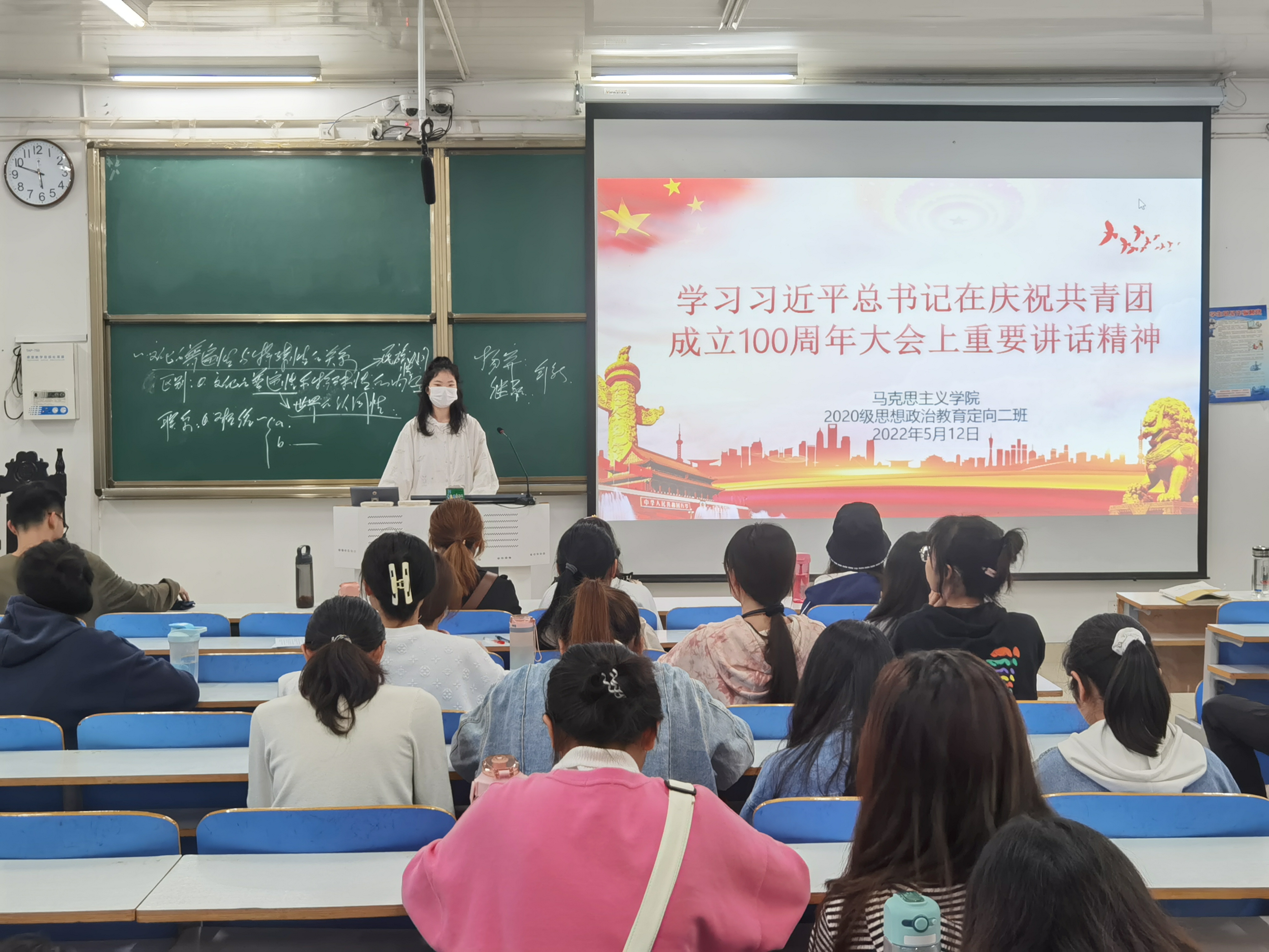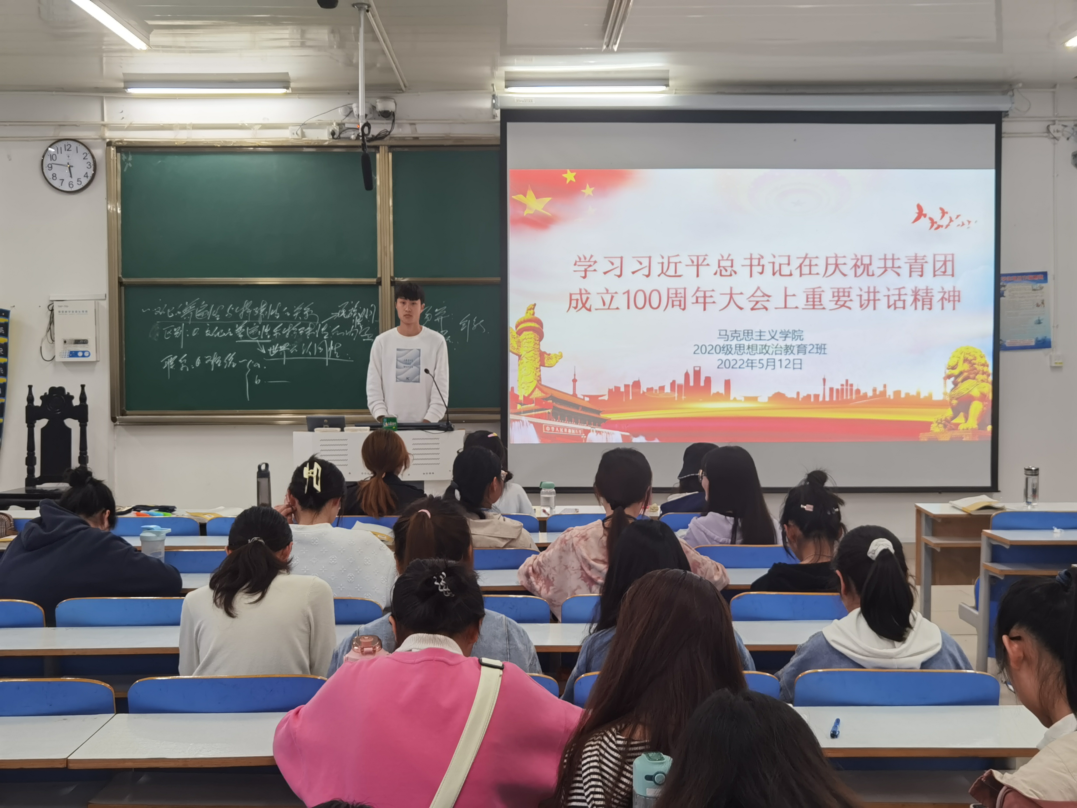 奋进新时代,百年正青春。5月12日下午,永利集团官网2020级思想政治教育二班、定向二班在社科楼514教室开展“学习习近平总书记在庆祝中国共产主义青年团成立100周年大会上的重要讲话”主题团课。2020级思想政治教育二班、定向二班全体团员共同参与本次团课。