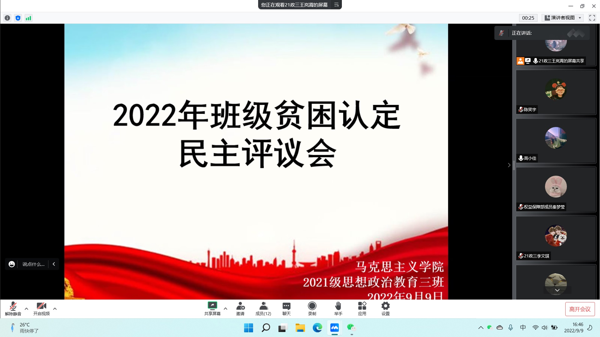 9月9日下午,永利集团官网2021级思想政治教育三班召开线上2022年班级贫困认定民主评议会。2021级思想政治教育三班贫困认定委员团全体成员以及权益保障部秦梦莹、宣传委员陈笑宇参与此次会议。会议由团支书王岚霄主持。