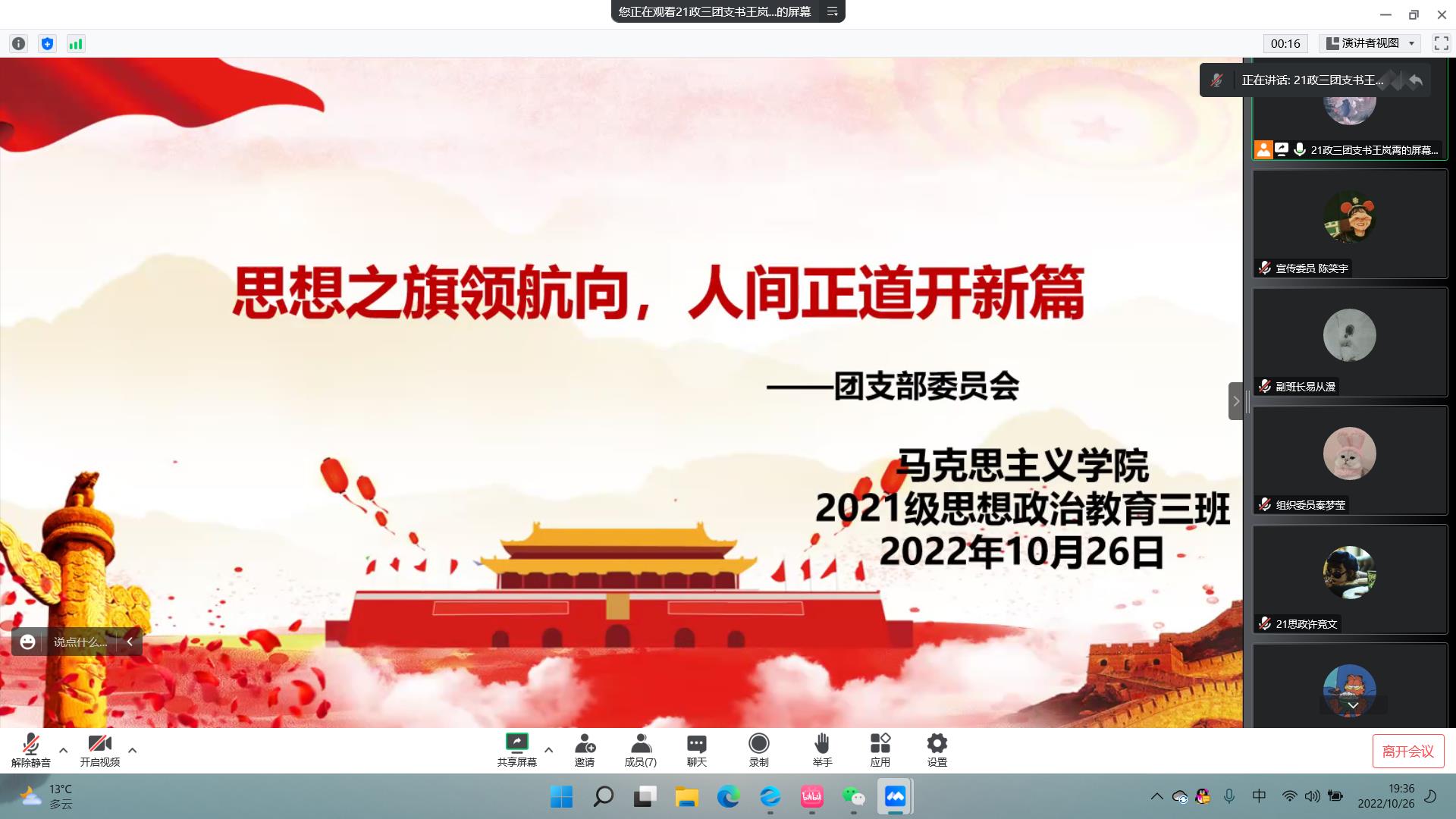 10月26日晚上,永利集团官网2021级思想政治教育三班召开线上“思想之旗领航向,人间正道开新篇”团支部委员会。永利集团官网2021级思想政治教育三班团支部委员会全体成员参与此次会议。会议由团支书王岚霄主持。