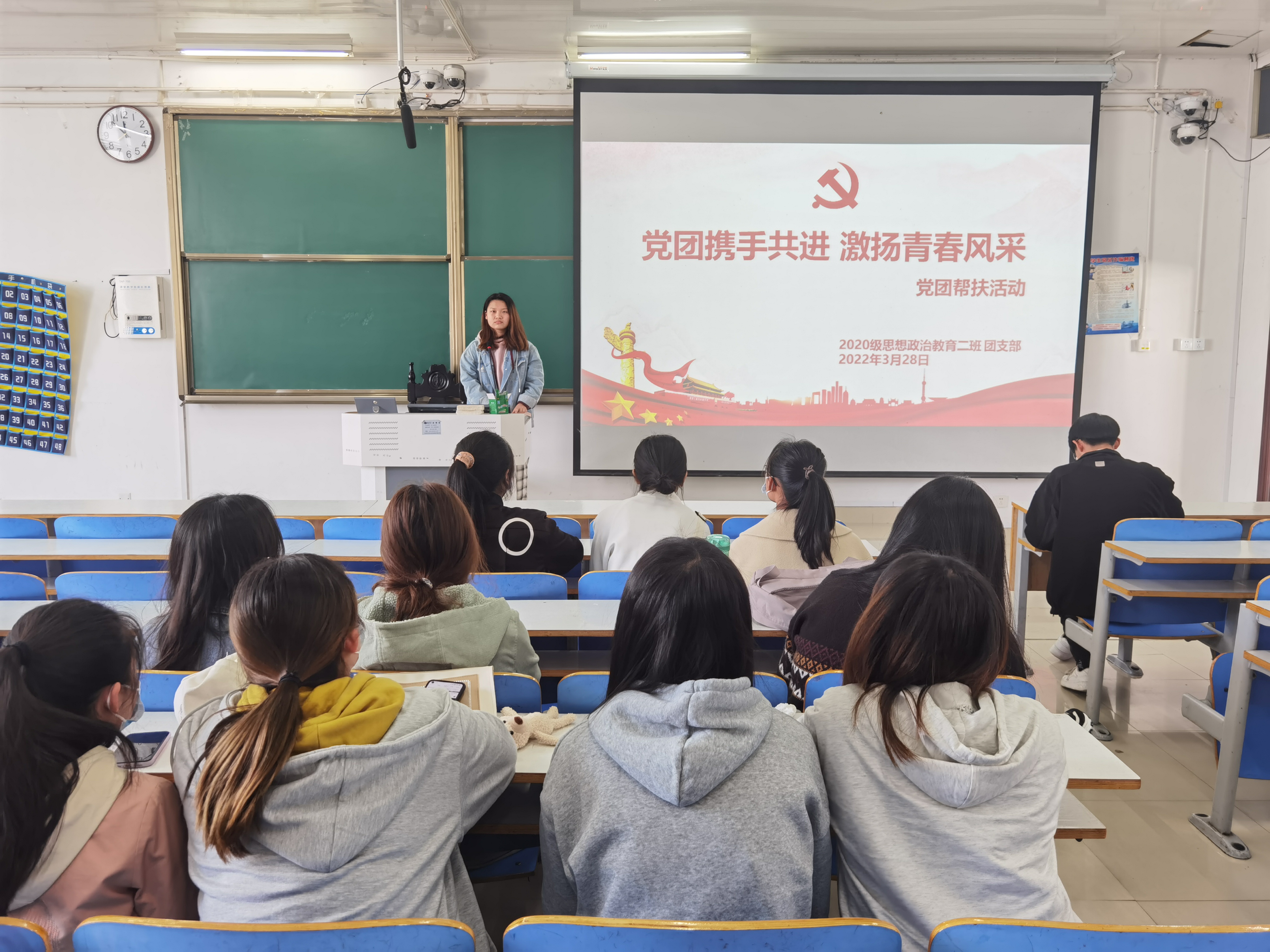 3月28日上午,永利集团官网2020级思想政治教育二班在社科楼514教室召开“党团携手共进,激扬青春风采”党团帮扶主题班会。2019级预备党员代表王明亮、周永宁及2020级思想政治教育二班全体团员共同参与本次班会。班会由团支书陈宇航主持。