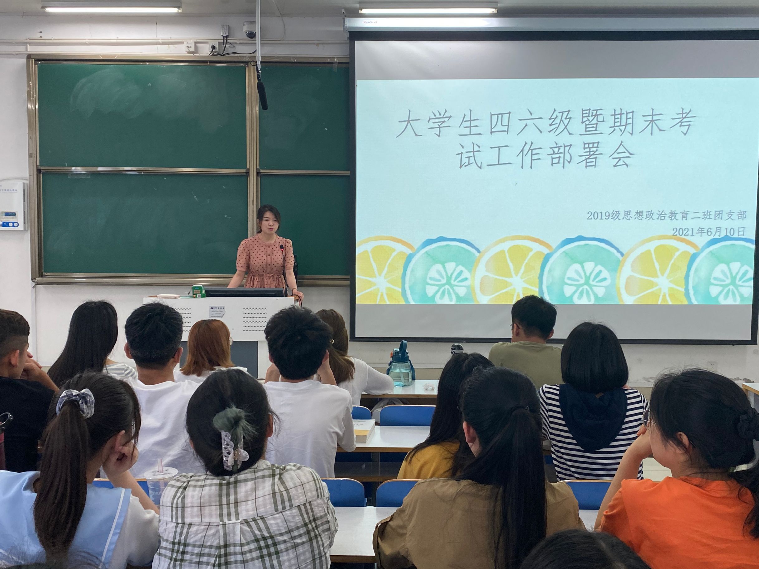 为严肃考风考纪,营造良好的学习、考试氛围,6月10日上午,永利集团官网2019级思想政治教育二班在社科楼516教室召开大学生四六级暨期末考试部署会。团委老师陶青青及2019级思想政治教育二班全体成员共同参会。会议由陶青青主持。