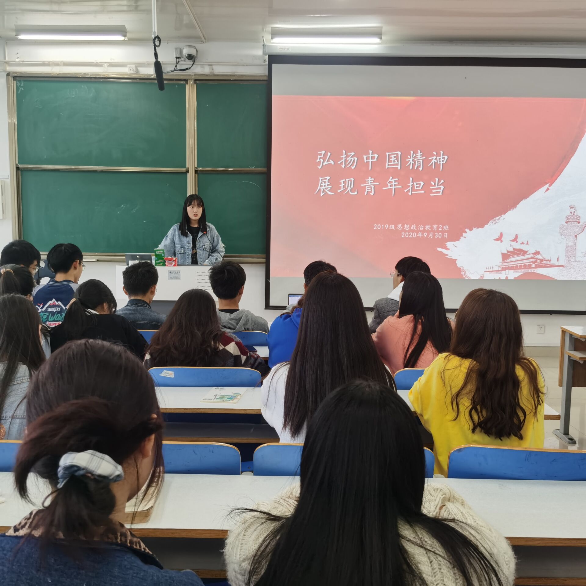 10月4日下午,永利集团官网2019级思想政治教育二班在社科楼514教室召开了“弘扬中国精神,展现青年担当”主题团课。2019级思想政治教育二班全体成员共同参会。会议由团支书孙雅娴主持。