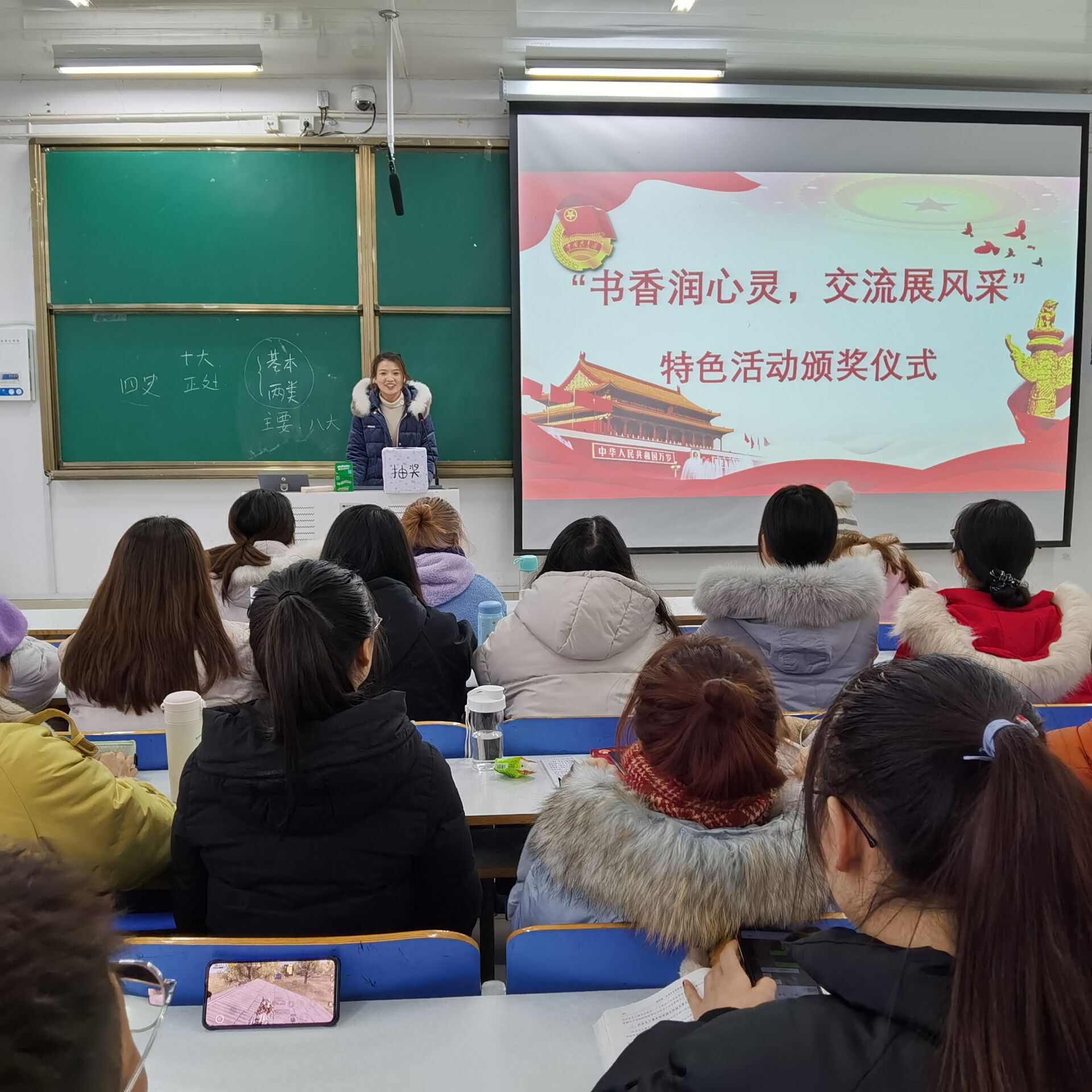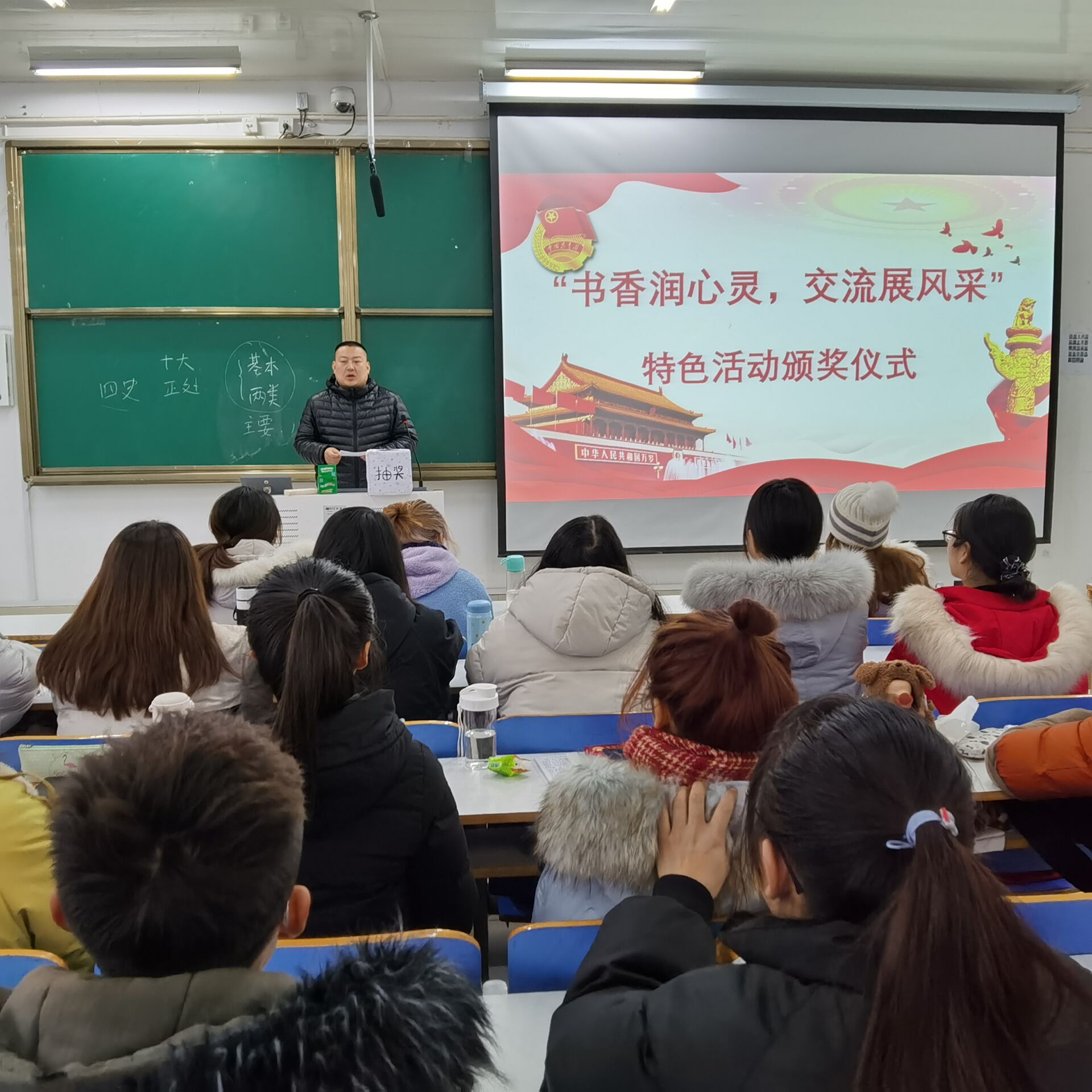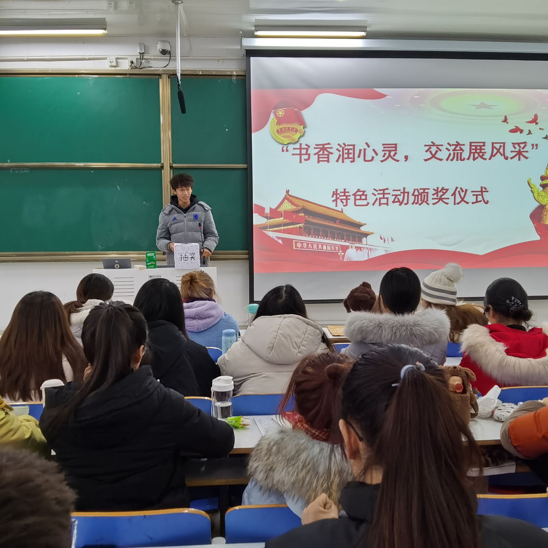 仪式正式开始前,何晓坚进行开场致辞,他指出,本次活动能增强班级凝聚力,对班级建设有积极作用。接着,陶青青主持颁奖环节,活动奖项为10个精心设计的“神秘”大礼包,7位同学凭实力与运气现场抽奖,陶青青现场揭秘并与全体学生共同见证开奖全过程。随后,获奖同学依次进行阅读分享,均表示本次活动给了自己一次提高勇气的机会,其他同学也主动分享自己的阅读心得,积极交流阅读感悟。最后,陶青青作总结,她指出,以分享书籍为主题,是希望同学们可以借此机会提升自身内涵。同时,她对同学们的积极参与给予充分肯定,并寄语同学们与书为伴,以书香润心灵,在今后的学习和生活中保持初心,勇敢追梦。