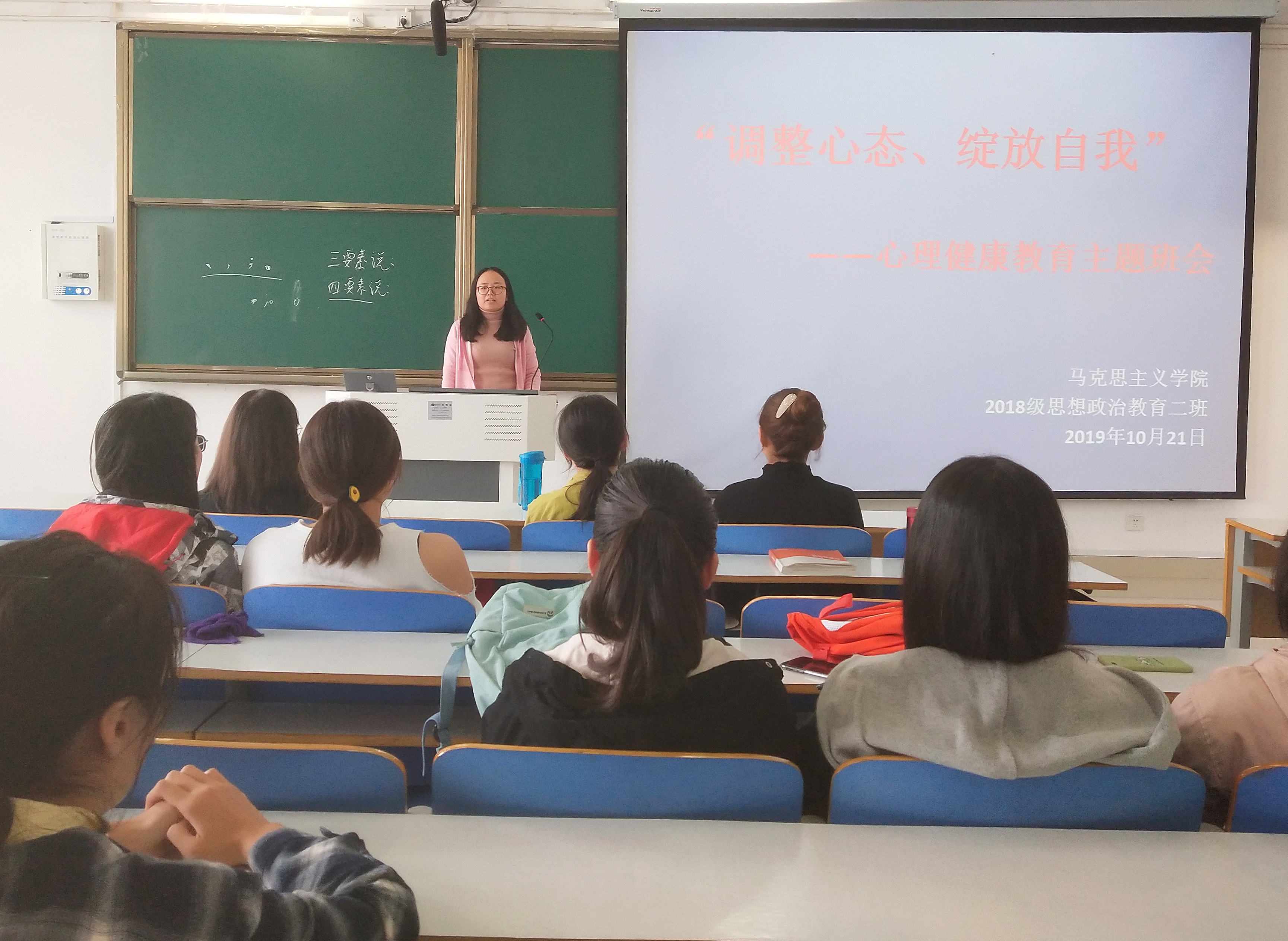 为进一步提高同学们的心理调节能力,保持良好的心理状态,10月21日上午,永利集团官网2018级思想政治教育二班于社科楼516教室顺利开展“调整心态,绽放自我”心理健康教育主题班会。我班邀请辅导员曹菁菁前来参加本次班会。班会由心理委员席妞主持。