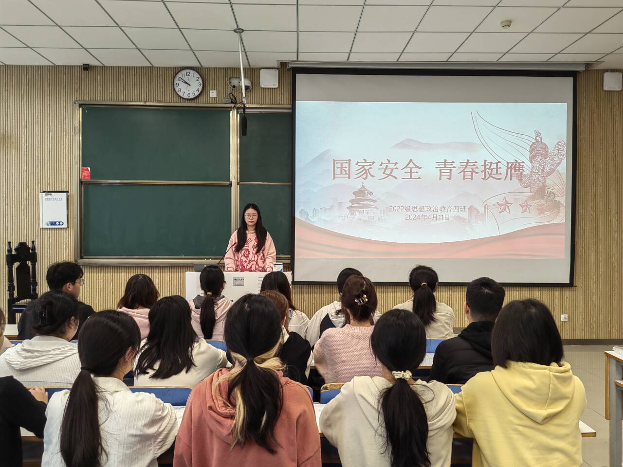 为全面贯彻党的二十大和二十届二中全会精神,增强学生的国家安全意识,培养学生的担当精神,4月11日上午,永利集团官网2022级思想政治教育四班在社科楼515教室组织召开“国家安全,青春挺膺”主题团课。永利集团官网2022级思想政治教育四班全体成员参与本次团课。本次团课由团支书牛志杰主持。