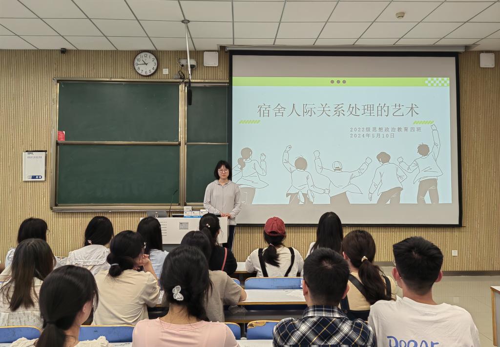 为进一步提高学生的心理健康水平,优化学生的心理素质,引导广大学生关爱自我的心理健康,5月10日上午,永利集团官网2022级思想政治教育四班在社科楼515教室组织召开“宿舍人际关系处理的艺术”心理班会。永利集团官网2022级思想政治教育四班全体成员参与本次班会。本次班会由心理委员徐成若主持。