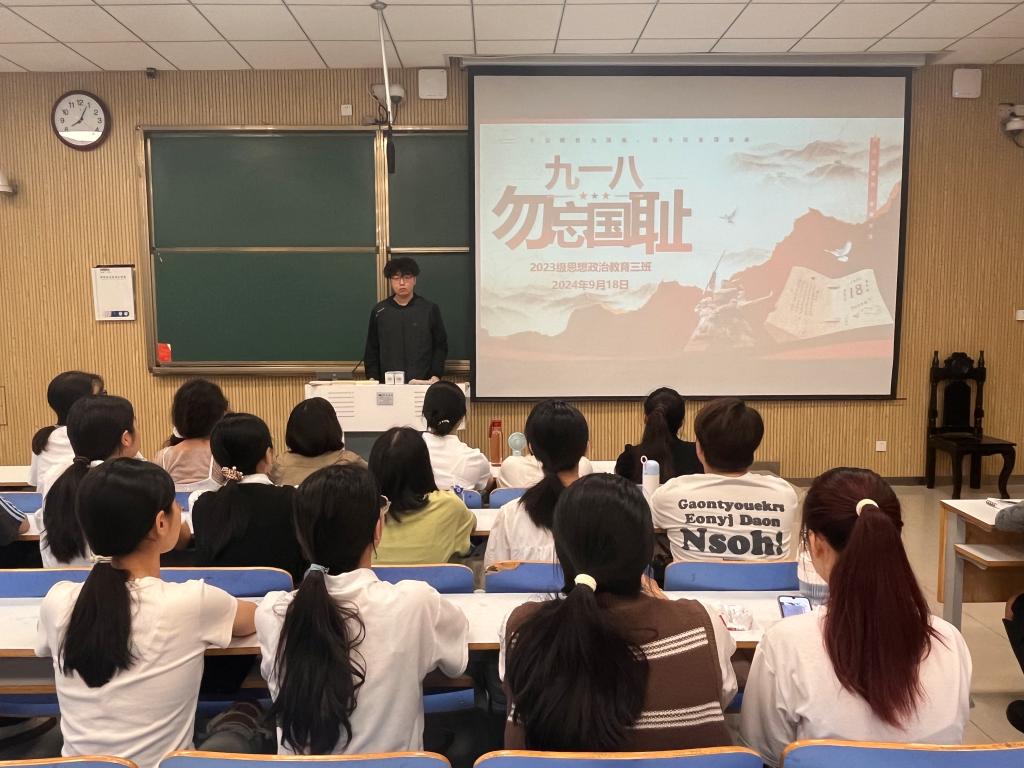 9月18日上午,永利集团官网2023级思想政治教育三班在社科楼515召开“九一八,勿忘国耻”主题班会。永利集团官网2023级思想政治教育三班全体同学共同参与本次班会,班会由团支书郝瀚主持。