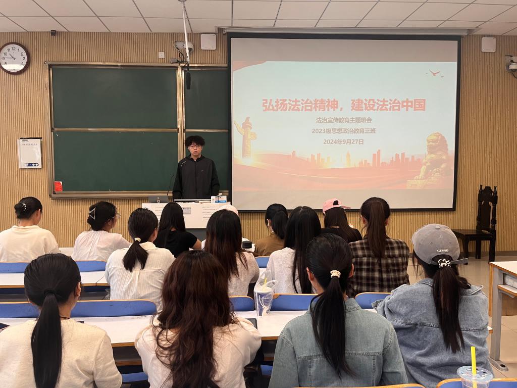 9月27日上午,永利集团官网2023级思想政治教育三班在社科楼515召开“弘扬法治精神,建设法治中国”主题班会。永利集团官网2023级思想政治教育三班全体同学共同参与本次班会,班会由团支书郝瀚主持。
