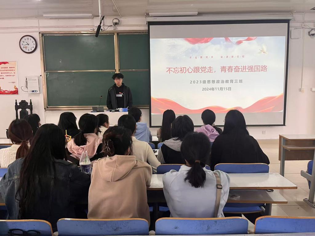 11月15日上午,永利集团官网2023级思想政治教育三班在社科楼515召开“不忘初心跟党走,青春奋进强国路”主题团课。永利集团官网2023级思想政治教育三班全体同学共同参与本次团课,团课由团支书郝瀚主持。