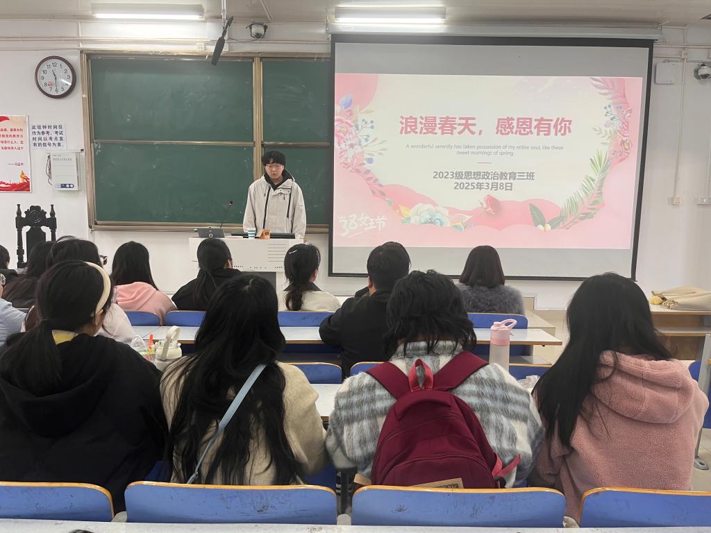 3月5日上午,永利集团官网2023级思想政治教育三班在社科楼515召开“浪漫春天,感恩有你”主题班会。永利集团官网2023级思想政治教育三班全体同学共同参与本次班会,班会由团支书郝瀚主持。