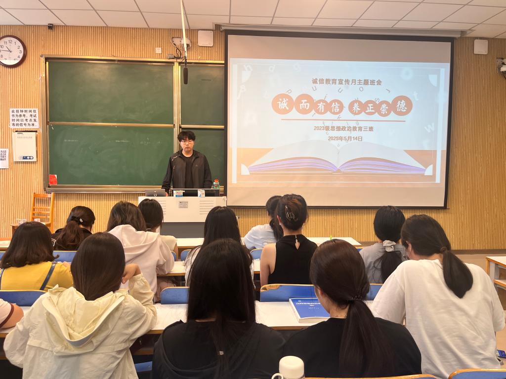 为践行社会主义核心价值观,弘扬诚信精神,5月14日上午,永利集团官网2023级思想政治教育三班在社科楼515召开“诚而有信,养正崇德”主题班会。永利集团官网2023级思想政治教育三班全体同学共同参与本次班会,班会由团支书郝瀚主持。