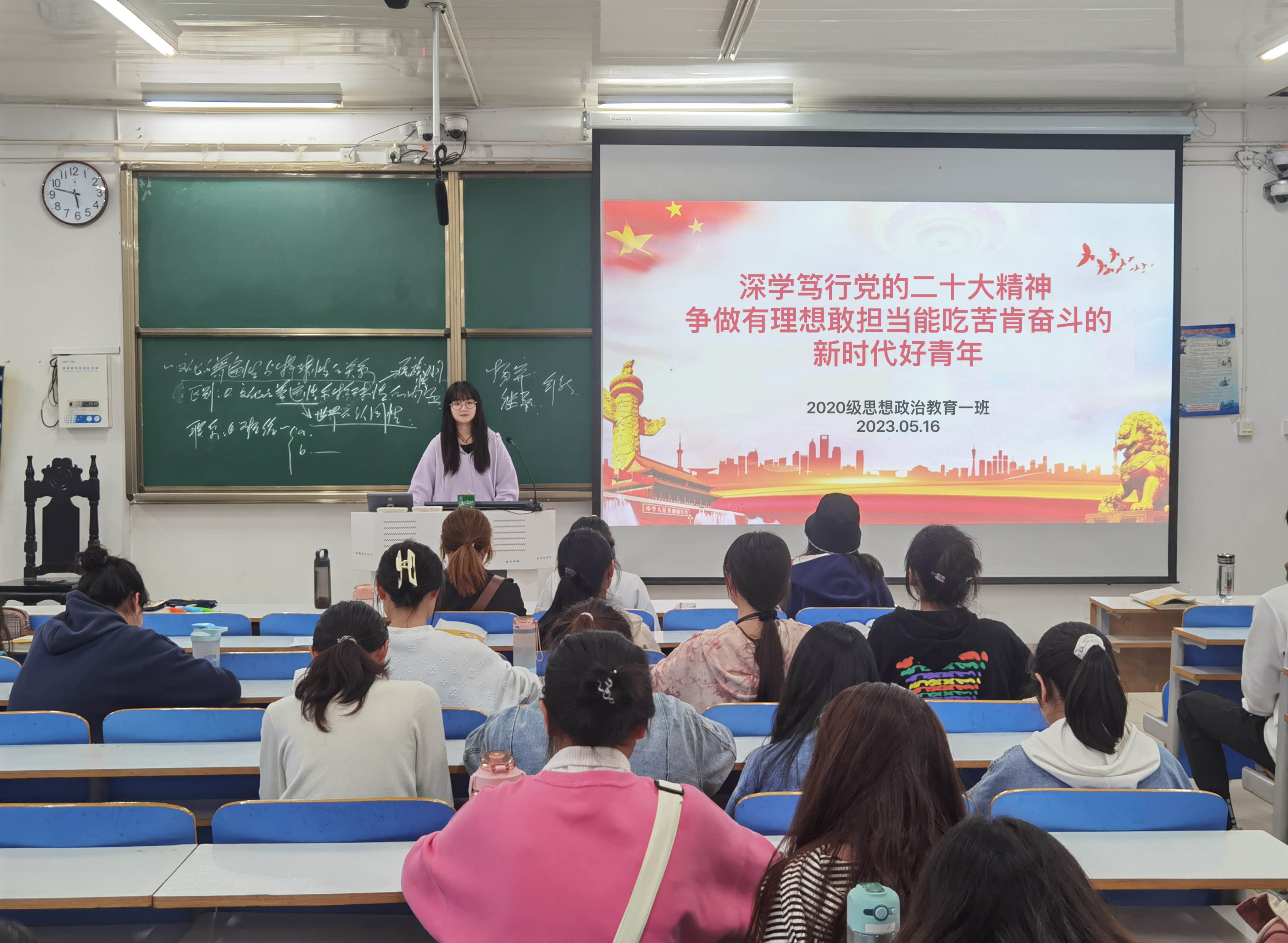 5月16日上午,永利集团官网2020级思想政治教育一班团支部在社科楼515教室召开“深学笃行党的二十大精神,争做有理想敢担当能吃苦肯奋斗的新时代好青年”主题教育活动。2020级思想政治教育一班团支部全体团员参加此次团课,团课由团支部书记卢茜雨主持。