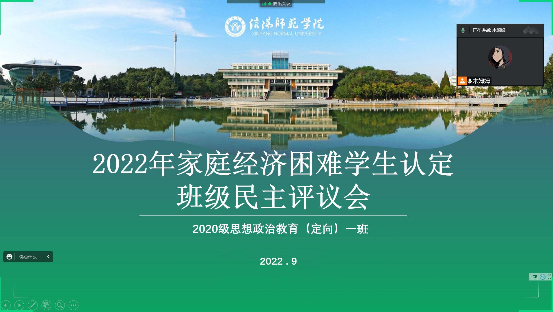 9月9日,永利集团官网2020级思想政治教育定向一班顺利举办2022年家庭经济困难学生认定班级民主评议会。本次会议采用线上与线下相结合的方式开展,定向一班全体学生参与了此次会议。