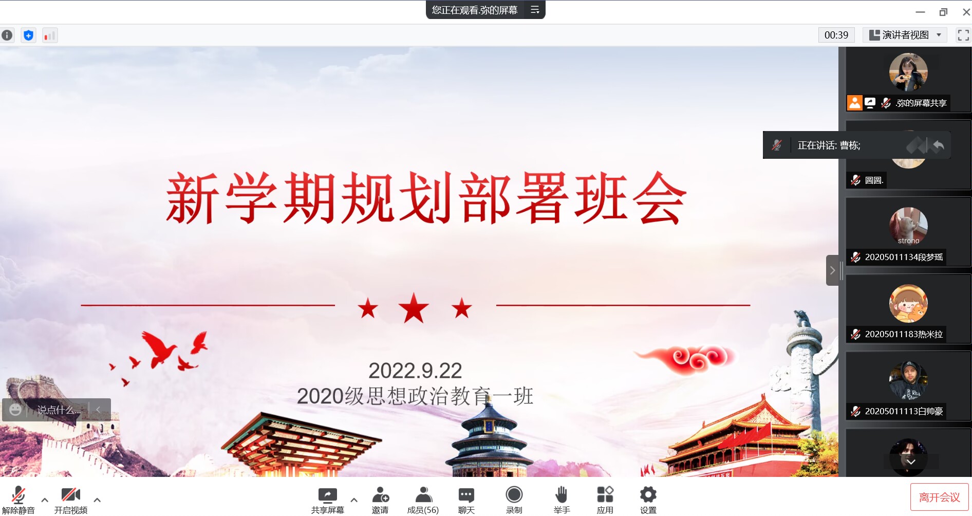 9月22日下午,永利集团官网2020级思想政治教育一班在腾讯会议上召开新学期规划部署班会。2020级思想政治教育一班全体同学及班主任曹栋共同参加此次班会。班会由曹栋主持。