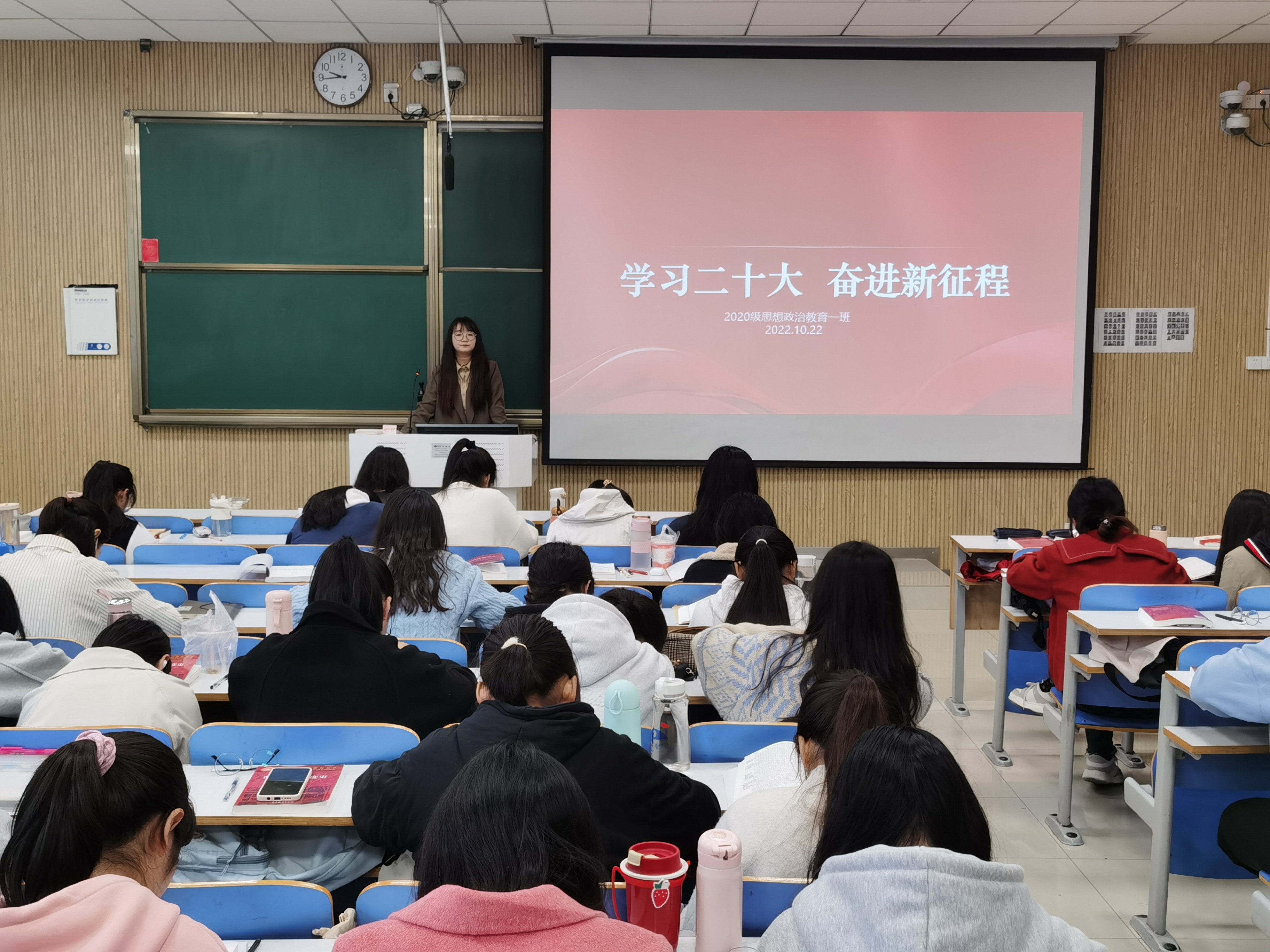 10月22日上午,永利集团官网2020级思想政治教育一班团支部在社科楼515教室开展“学习二十大,奋进新征程”主题团课。2020级思想政治教育一班团支部全体团员参加此次团课,团课由团支部书记卢茜雨主持。