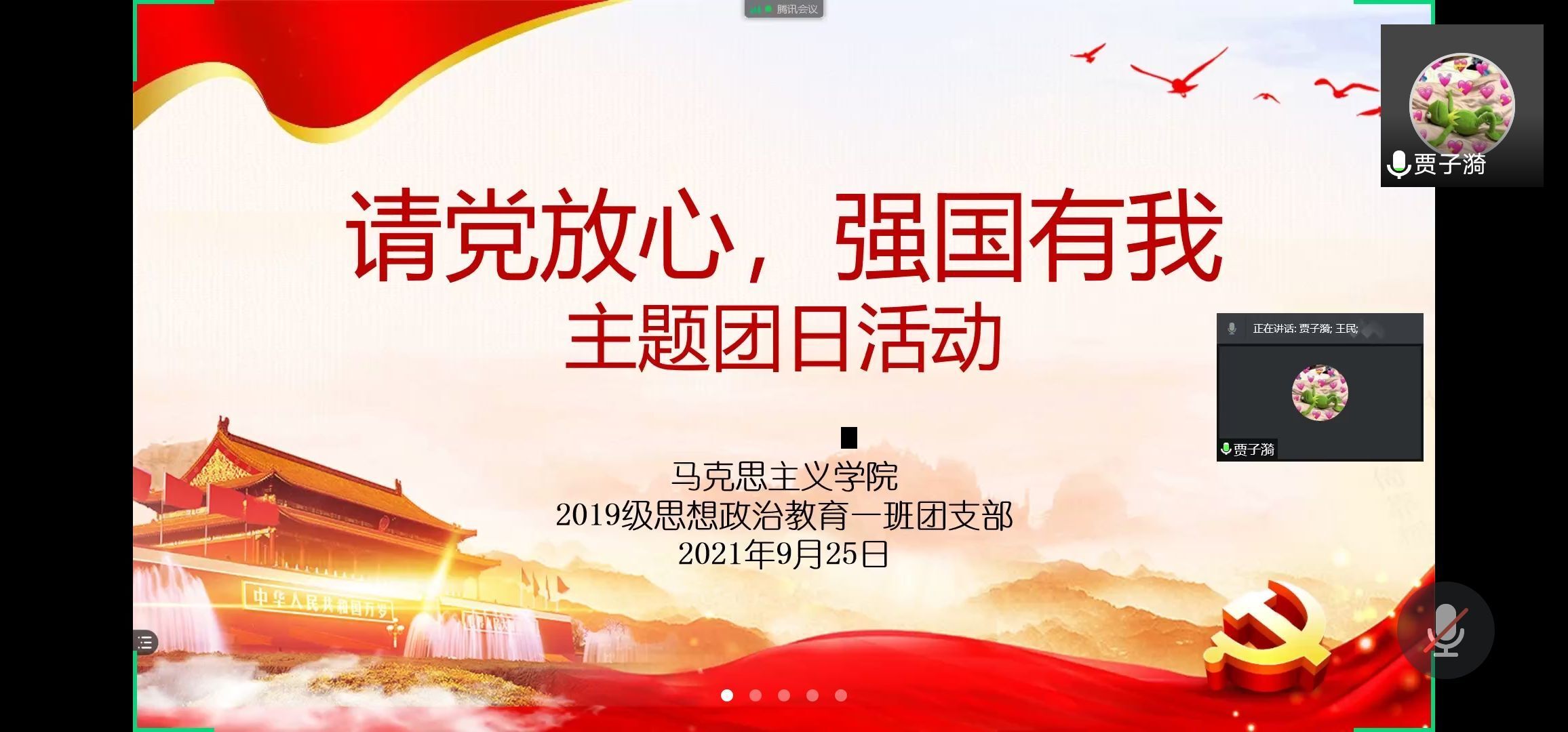9月25日下午,永利集团官网2019级思想政治教育一班第一团支部在腾讯视频举办“请党放心,强国有我”主题团日活动。永利集团官网2019级思想政治教育一班全体团员参加本次活动。活动由团支书贾子漪主持。