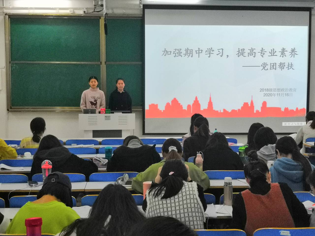 为了充分发挥党员干部的先锋模范作用,11月16日下午,永利集团官网2018级思想政治教育一班在社科楼514教室顺利开展以“加强期中学习,提升专业素养”为主题的党团帮扶会议。中共党员孙慧萍、王琳、2018级第一团支部全体成员共同参与本次会议。会议由团支部书记靳雨露主持。