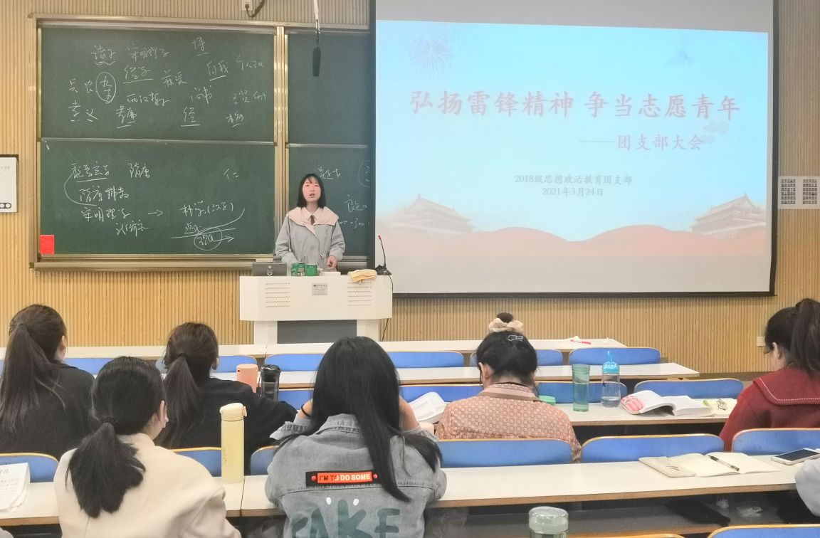 3月26日上午, 永利集团官网2018级思想政治教育团支部在社科楼516教室顺利开展“弘扬雷锋精神,争当志愿青年”主题会议。2018级全体学生共同参加此次会议。会议由第一团支部书记靳雨露主持。