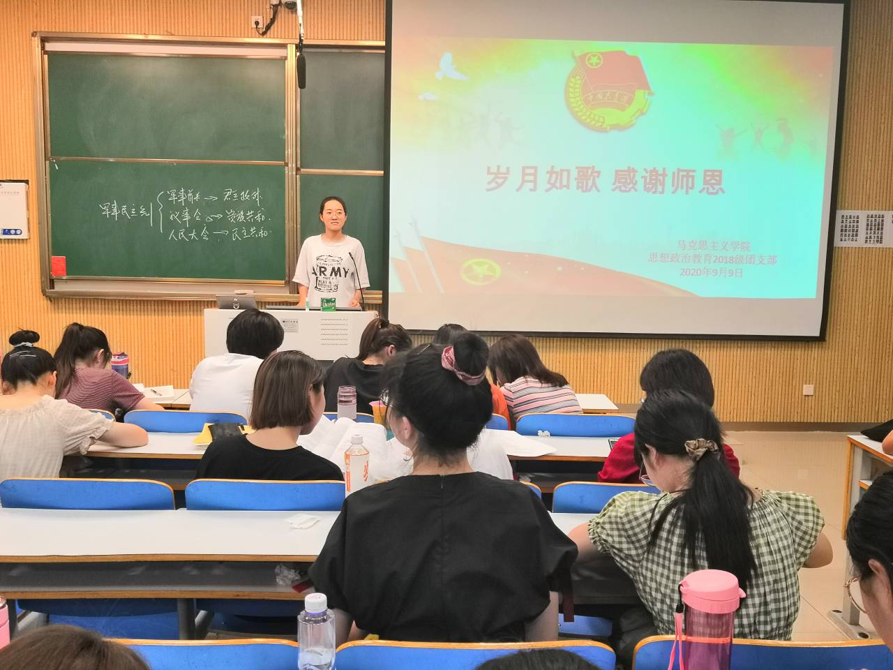 9月8日上午,永利集团官网2018级思想政治教育团支部在社科楼515教室顺利开展“岁月如歌,感谢师恩”主题团会。2018级全体学生共同参加此次会议。会议由第二团支部书记黄子晋主持。