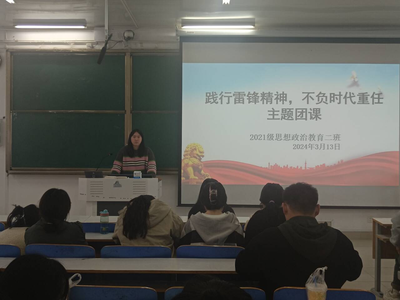 首先,王婧欣表示,新时代学习雷锋精神成为正确引导广大青年思想道德发展方向,践行社会主义核心价值体系的良好手段和途径。随后,她向大家讲述雷锋同志的生平事迹,并指出习近平总书记对弘扬雷锋精神作出一系列重要论述,赋予了雷锋精神新的时代价值,拓展了雷锋精神新的时代内涵,阐明了实践雷锋精神新的时代要求。接着,她强调,无论时代如何变迁,雷锋精神永不过时,要用实际行动传承雷锋精神,这就要求我们必须在学习中体会,在实践中升华,从内心深处理解雷锋精神。最后,王婧欣对本次团课进行总结,并对大家提出把雷锋精神贯穿于日常生活中的要求。