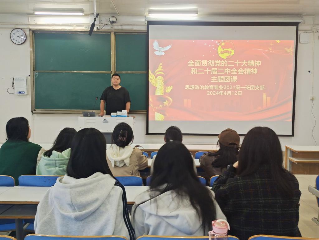 4 月12日下午,永利集团官网2021级思想政治教育一班在社科楼514教室召开“全面贯彻党的二十大精神和二十届二中全会精神”主题团课。2021级思想政治教育一班全体团员参加了本次团课。团课由团支书戴翰林主持。