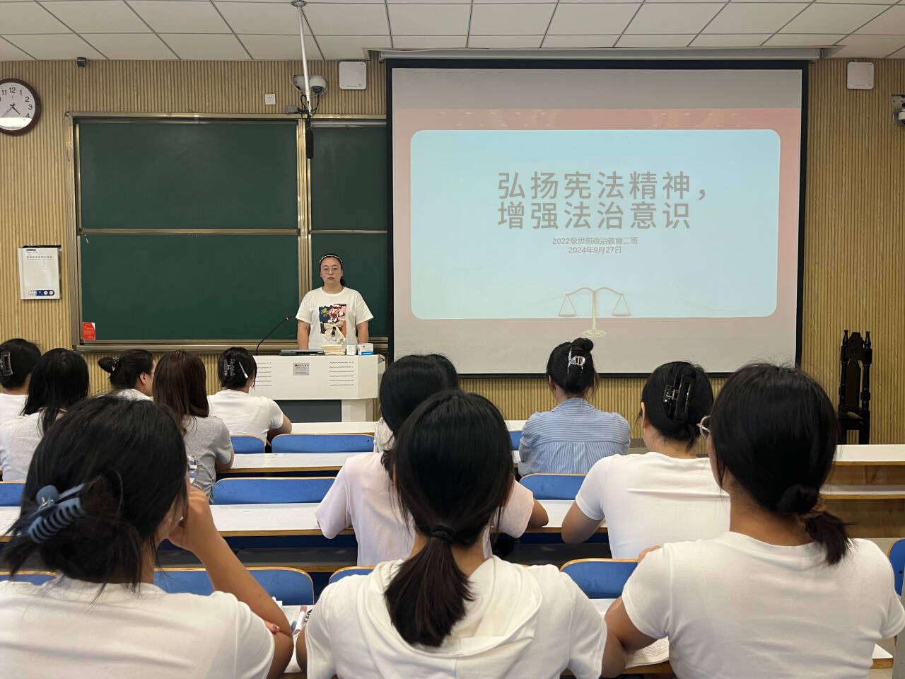 9月27日下午,永利集团官网2022级思想政治教育二班在社科楼515教室召开“弘扬宪法精神,增强法治意识”主题班会。永利集团官网2022级思想政治教育二班全体成员共同参与此次班会。会议由班长李佳音主持。