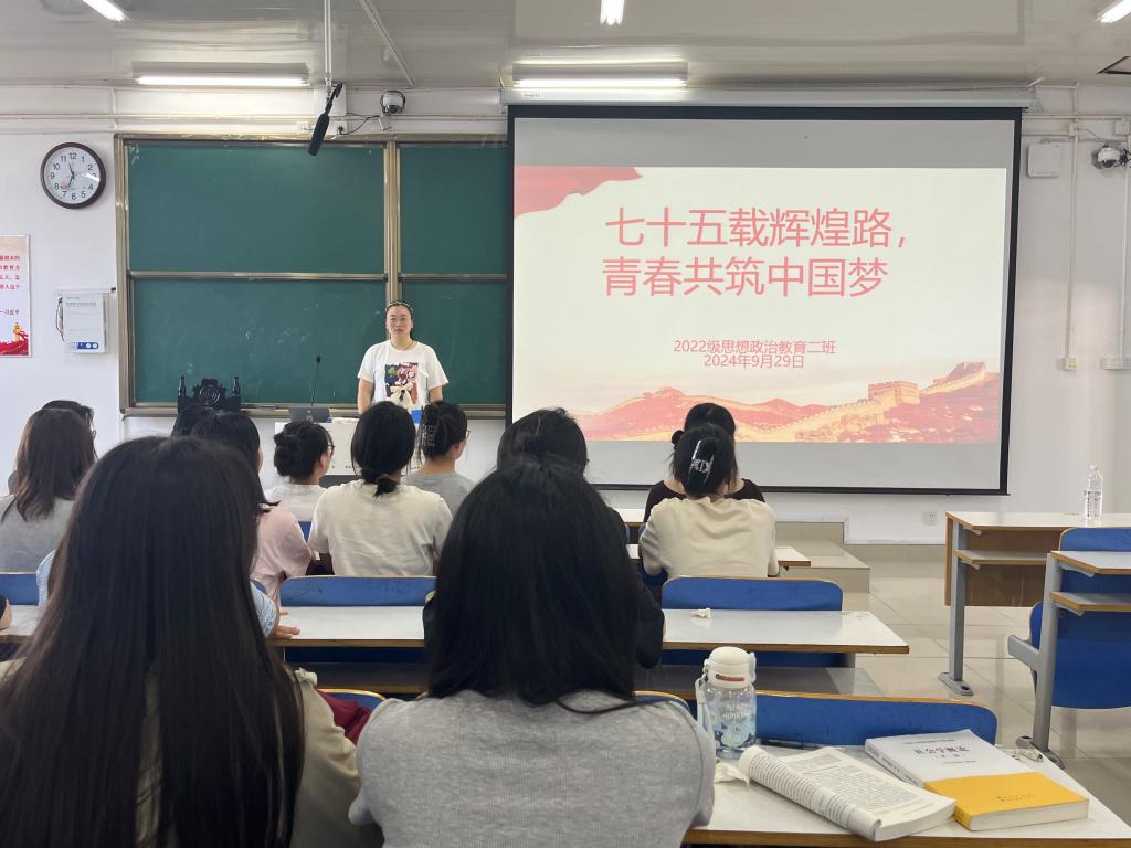 为热烈庆祝中华人民共和国成立75周年,弘扬爱国主义精神,9月30日上午,永利集团官网2022级思想政治教育二班在社科楼514教室召开“七十五载辉煌路,青春共筑中国梦”主题团课。永利集团官网2022级思想政治教育二班全体成员共同参与此次团课。团课由团支书李佳音主持。