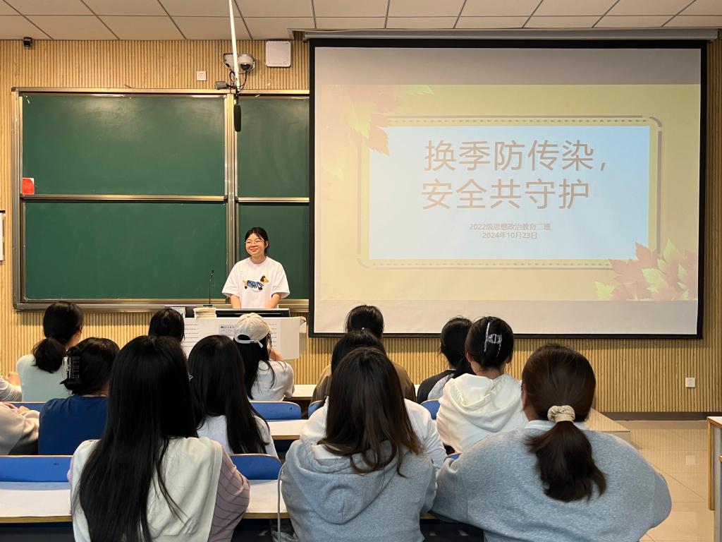 首先,冯伟珈向同学们介绍了秋季常见的传染病种类,例如流感、麻疹、手足口病、水痘、出血热、肠道传染病和诺如病毒感染等。随后,又详细讲解了这些传染病的传播途径、症状表现,强调了保持良好的个人卫生习惯是预防传染病的关键。此外,冯伟珈还强调了健康的重要性,向同学们讲解了预防秋季传染病的措施,如进行合理的体育锻炼以增强免疫力、养成良好的卫生习惯,加强个人卫生及个人防护、注意天气变化,随时增减衣物,避免着凉等,同学们纷纷表示要坚持早预防、早发现的原则,养成良好的生活习惯。