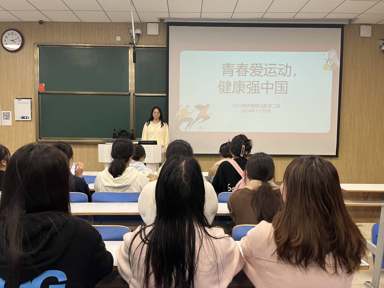 为进一步提高大学生健康生活的意识,增强学生体质和综合素质,11月8日下午,永利集团官网2022级思想政治教育二班在社科楼515教室召开“青春爱运动,健康强中国”主题班会。永利集团官网2022级思想政治教育二班全体成员共同参与此次班会。会议由文体委员马路畅主持。