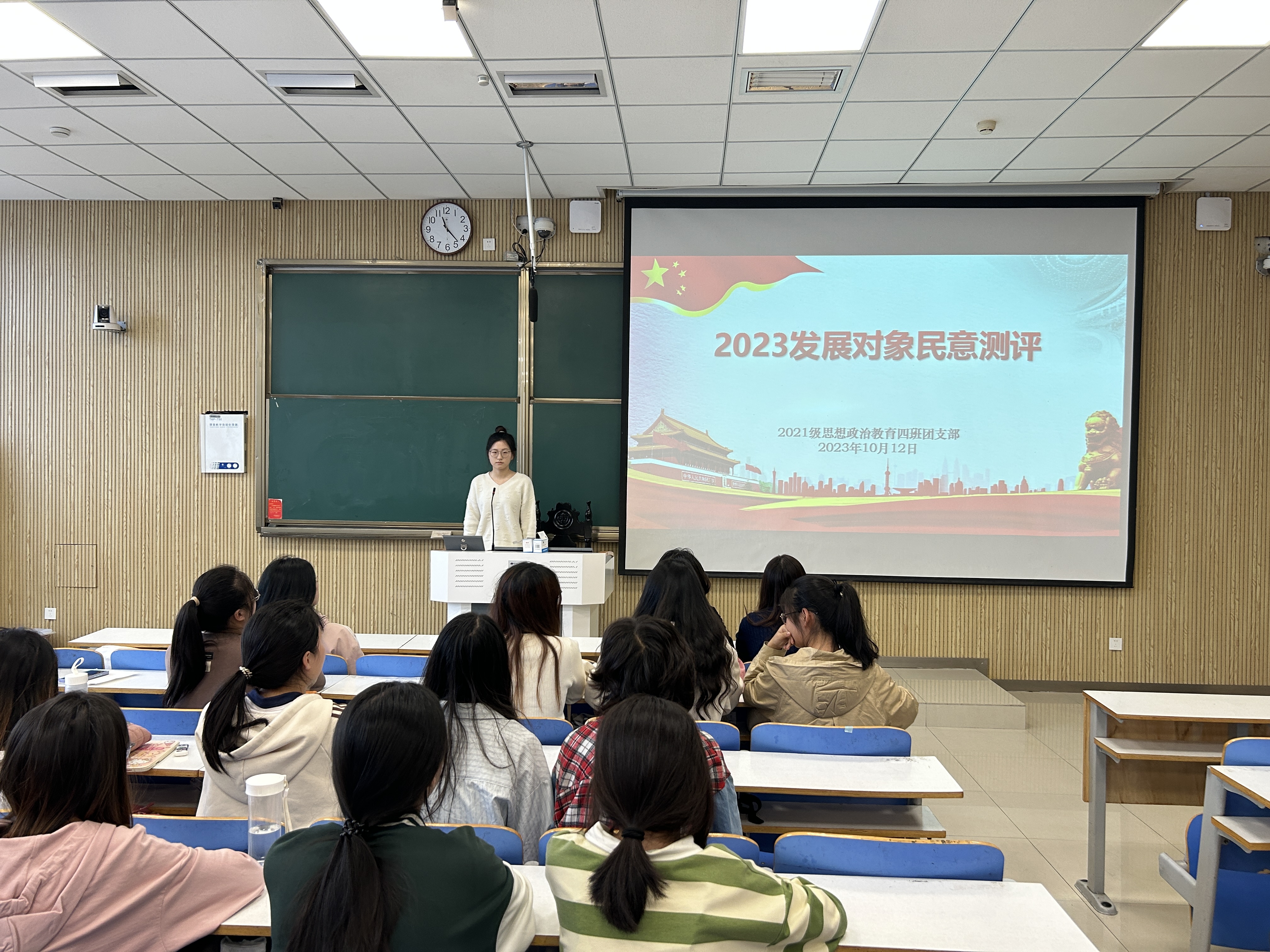 10月12日下午,永利集团官网2021级思想政治教育四班在社科楼514教室召开2023年发展对象民意测评会。2021级思想政治教育四班全体团员共同参会。会议由团支书刘珂含主持。