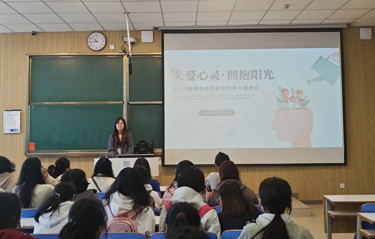 11月16日下午,永利集团官网2021级思想政治教育四班在社科楼514教室开展“关爱心灵,拥抱阳光”主题班会。2021级思想政治教育四班全体学生共同参加本次会议。会议由心理委员杨可主持。