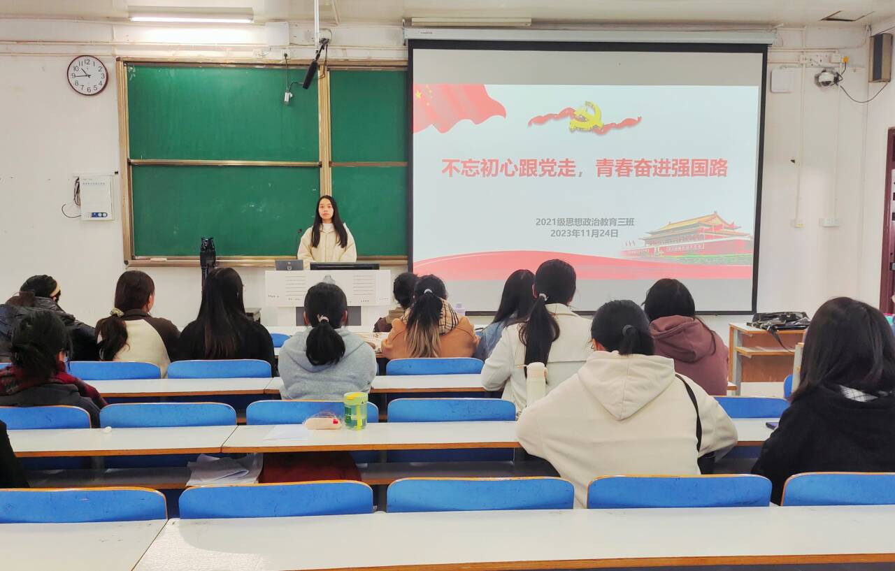 11月24日下午,永利集团官网2021级思想政治教育三班在社科楼514教室举办“不忘初心跟党走,青春奋进强国路”主题团课。2021级思想政治教育三班全体团员参加了此次团课。团课由团支书王岚霄主持。