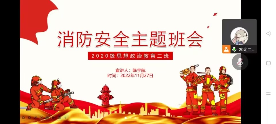11月27日晚,永利集团官网2020级思想政治教育二班通过腾讯会议召开线上消防安全主题班会。2020级思想政治教育二班全体学生共同参与本次班会。班会由团支书陈宇航主持。